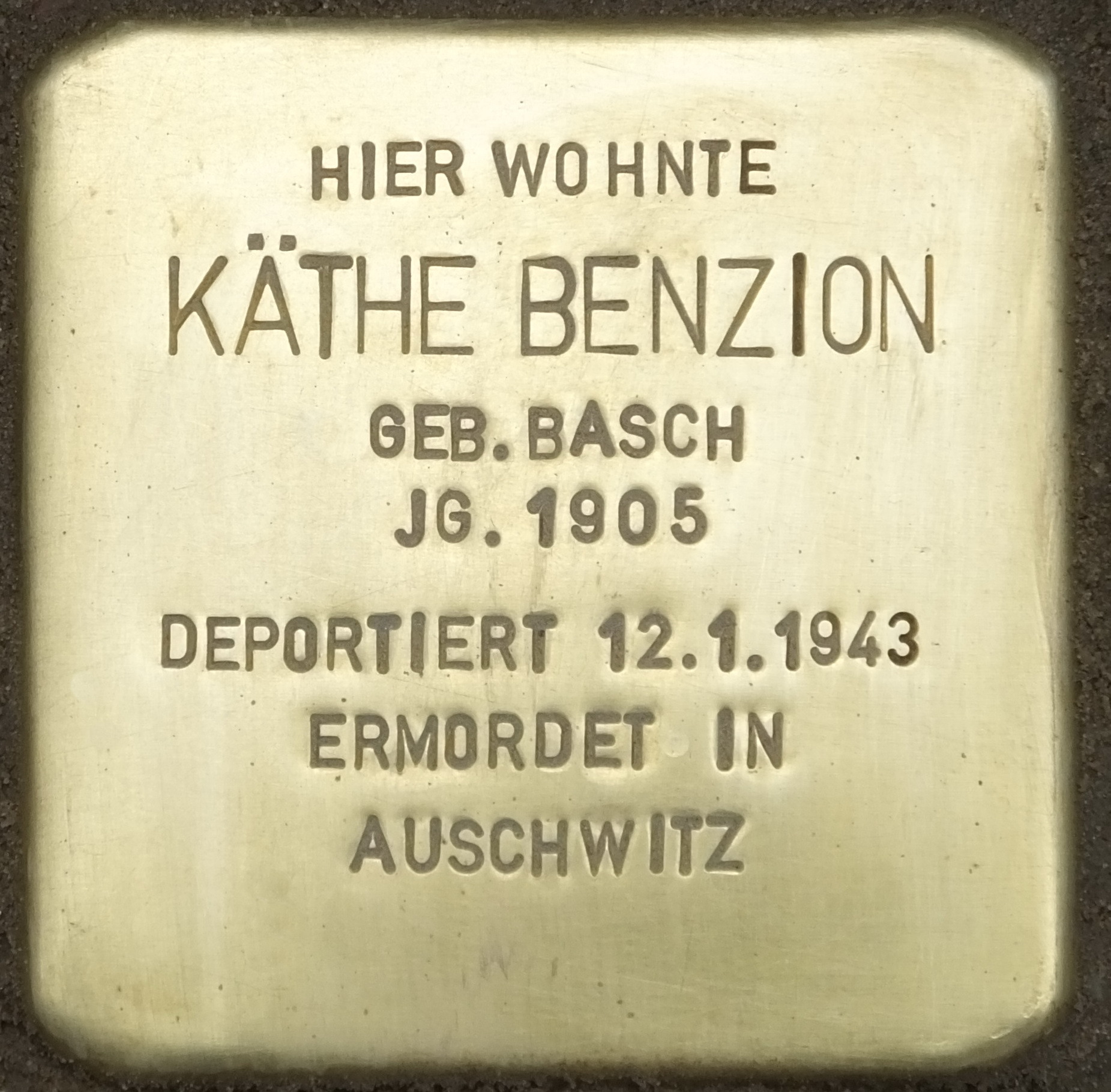 Am 12. Januar 1943 wurden von hier 74 Menschen aller Altersstufen mit einem riesigen Transport, es waren insgesamt 1196 Insassen, unter ihnen die Schriftstellerin Else Ury, nach Auschwitz verschleppt. Haben Käthe, Marianne und Eva ihren Mann und Vater, der 8 Monate später im Konzentrationslager ankam, noch einmal gesehen? Oder wurden sie sofort nach ihrer Ankunft ermordet? Käthe Benzion war noch jung, 38 Jahre alt. Es ist denkbar, dass sie im Lager oder einem der Industriebetriebe in der Nähe Zwangsarbeit leisten musste, bis sie vor Entkräftung starb. Das Leben und Sterben Käthe Benzions und ihrer beiden Kinder Eva und Marianne bleibt weitgehend im Dunkeln. Die wenigen überlieferten Informationen werfen mehr Fragen auf, als sie Antworten geben können.