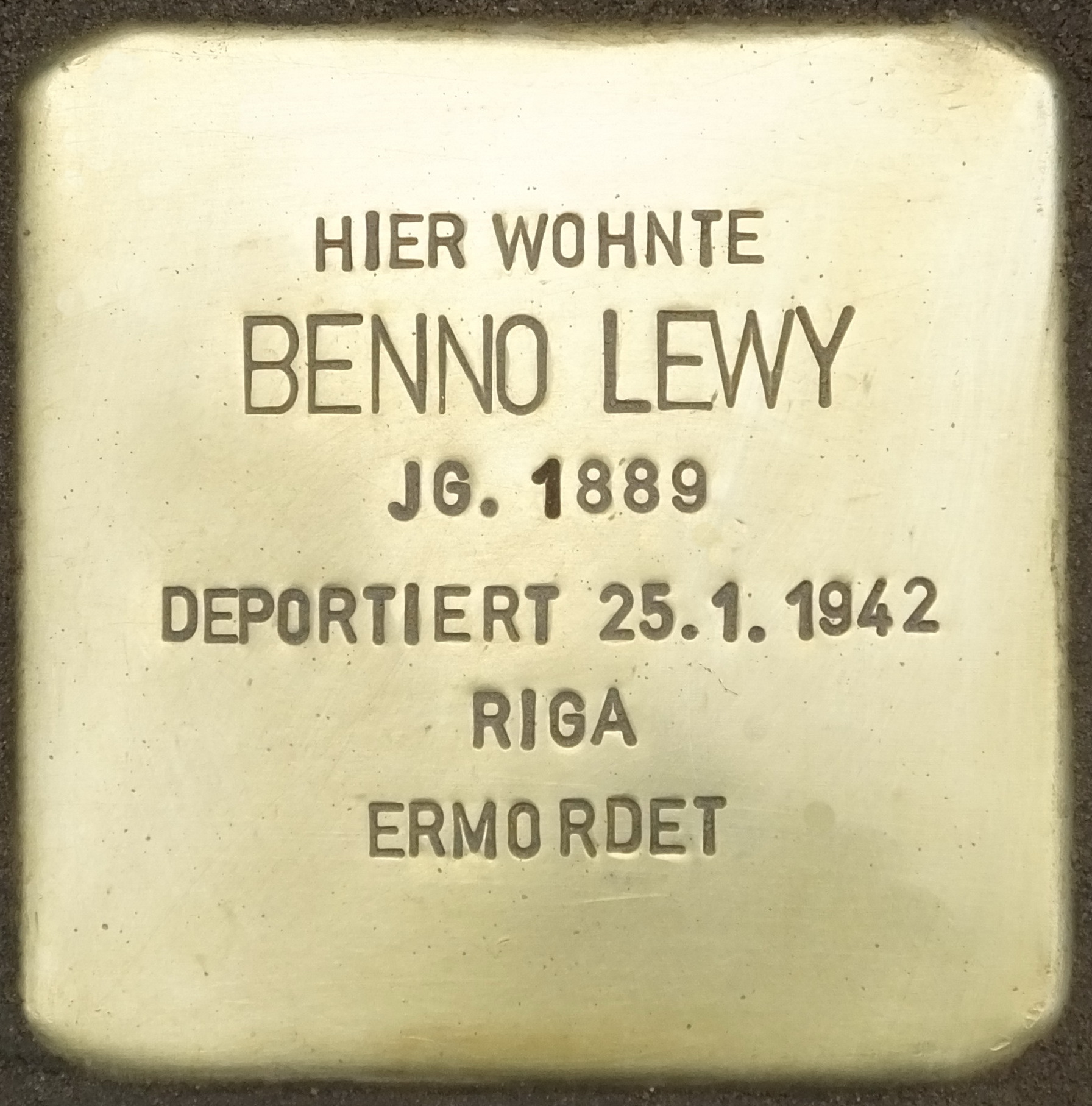 Benno Lewy wurde von der Gestapo aus der Wohnung in der Sybelstraße 58 verschleppt und in die als Sammellager missbrauchte Synagoge in der Levetzowstraße gebracht. Am 25. Januar 1942 wurde er mit dem Transport 10 nach Riga deportiert. Die Abfahrt dieses „10. Osttransportes“ erfolgte vom Bahnhof Grunewald aus. Die Menschen wurden in gedeckten Güterwagen transportiert und der in diesem Winter herrschenden Kälte ungeschützt ausgesetzt, sodass bei der Ankunft in Riga viele bereits erfroren oder durch die Kälte stark geistig verwirrt waren. Sie wurden bei der Ankunft in Riga Skirotava sofort erschossen. Von den 1044 mit diesem Zug deportierten Menschen überlebten nur 13. Benno Lewy gehört nicht dazu.