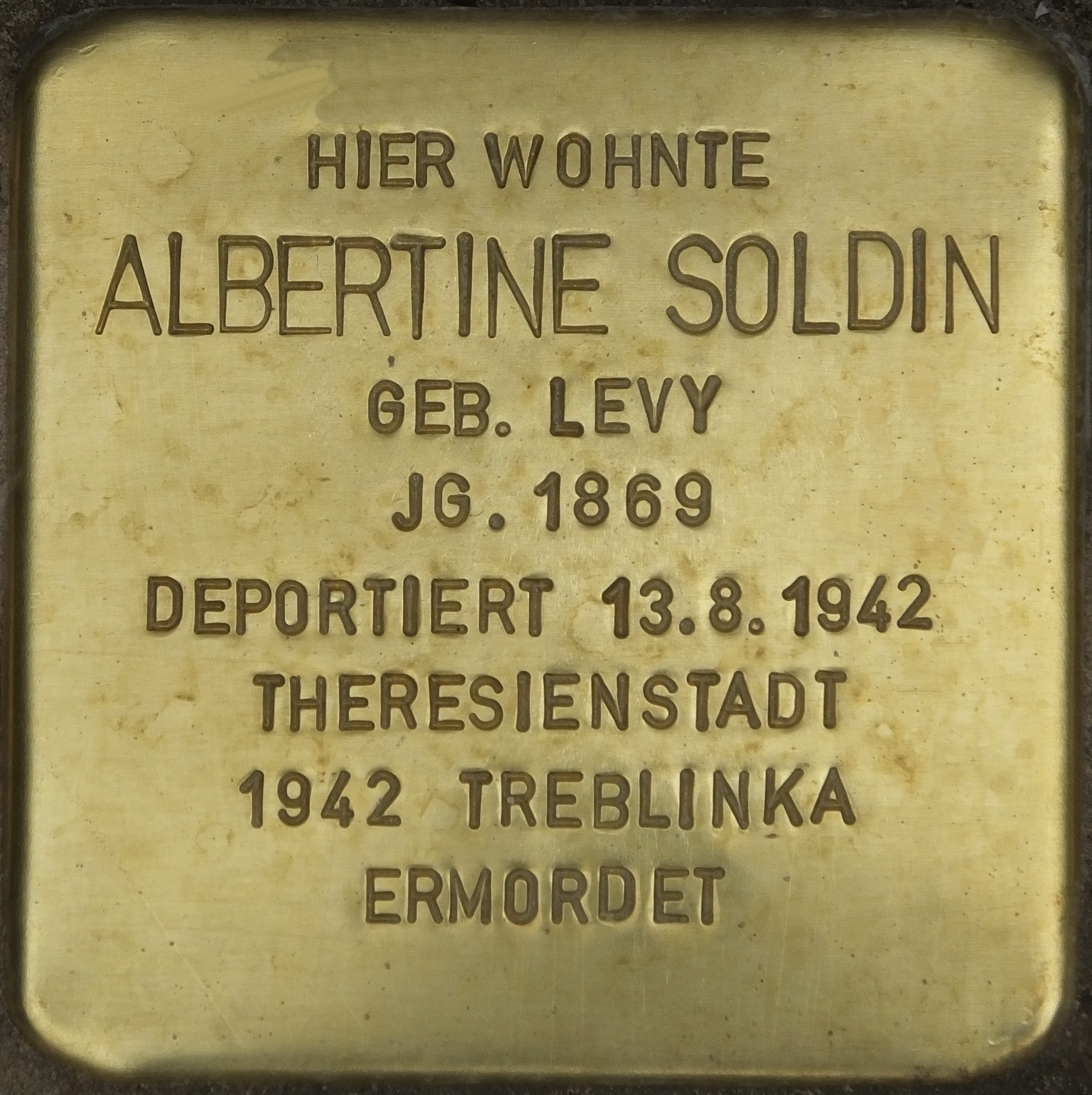 Albertine Soldin musste sich in der Sammelstelle Große Hamburger Straße 26 melden und wurde mit einem als 43. Alterstransport registrierten Zug vom Anhalter Bahnhof am 13. August 1942 nach Theresienstadt deportiert. Am 23. September 1942 wurde sie ins Vernichtungslager Treblinka weiterdeportiert, wo sie ermordet worden ist.