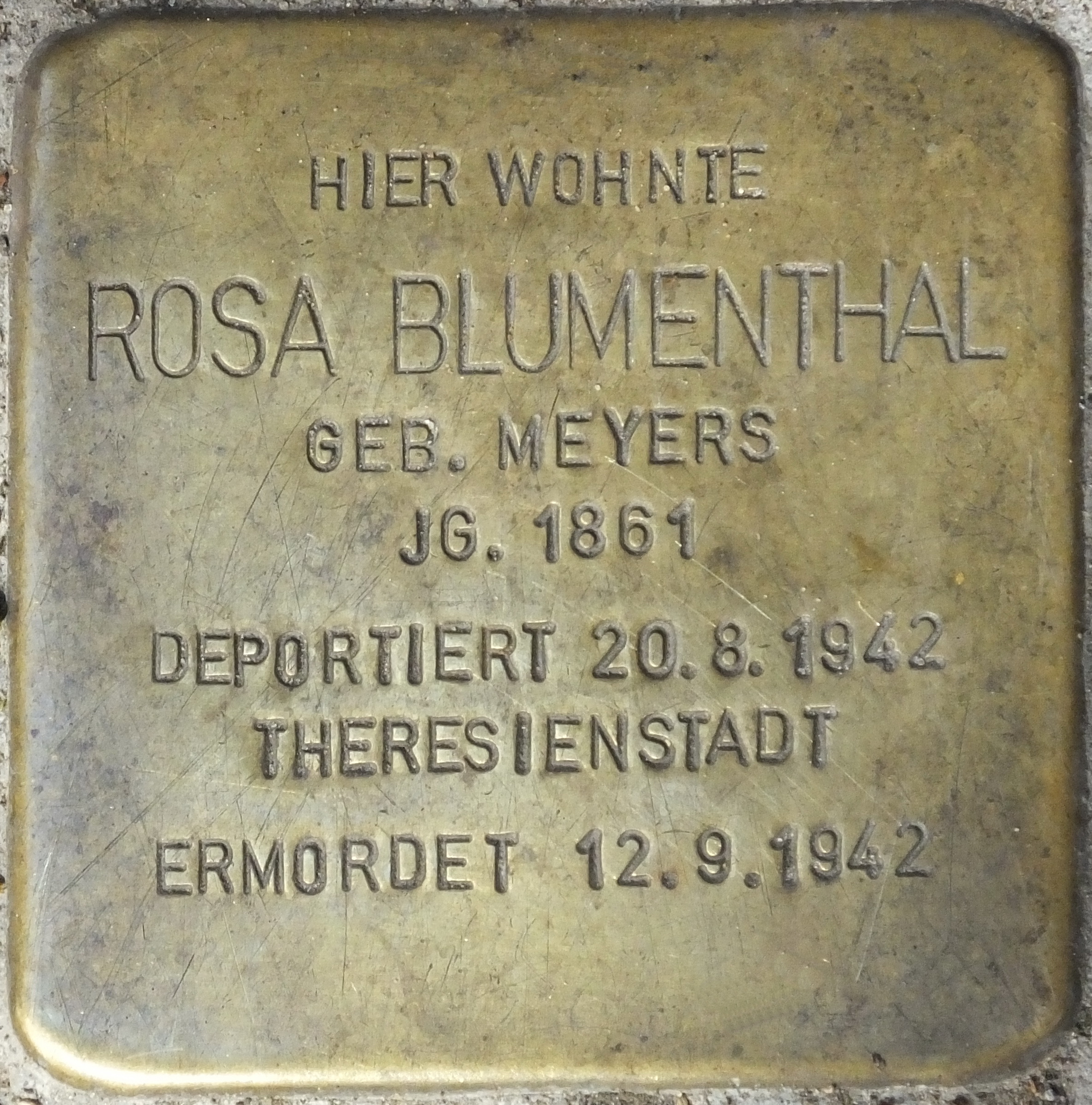 Wie alle Jüdinnen und Juden musste Rosa Blumenthal in der Öffentlichkeit den gelben Judenstern tragen. Sie wurde im 82. Lebensjahr am 20.8.1942 vom Anhalter Bahnhof in einem von zwei mit je 50 Menschen besetzten Waggons nach Theresienstadt deportiert und dort am 12.9.1942 ermordet. Die Todesurkunde aus Theresienstadt ist erhalten und in der Opferdatei unter http://109.123.214.108/de/document/DOCUMENT.ITI.4215 zu sehen. Die dort angegebene, von vier Ärzten bestätigte Todesursache „Darmkatarrh“ ist eine Umschreibung dafür, dass sie an Unterernährung und den miserablen hygienischen Zuständen im Ghetto zugrunde gegangen ist.