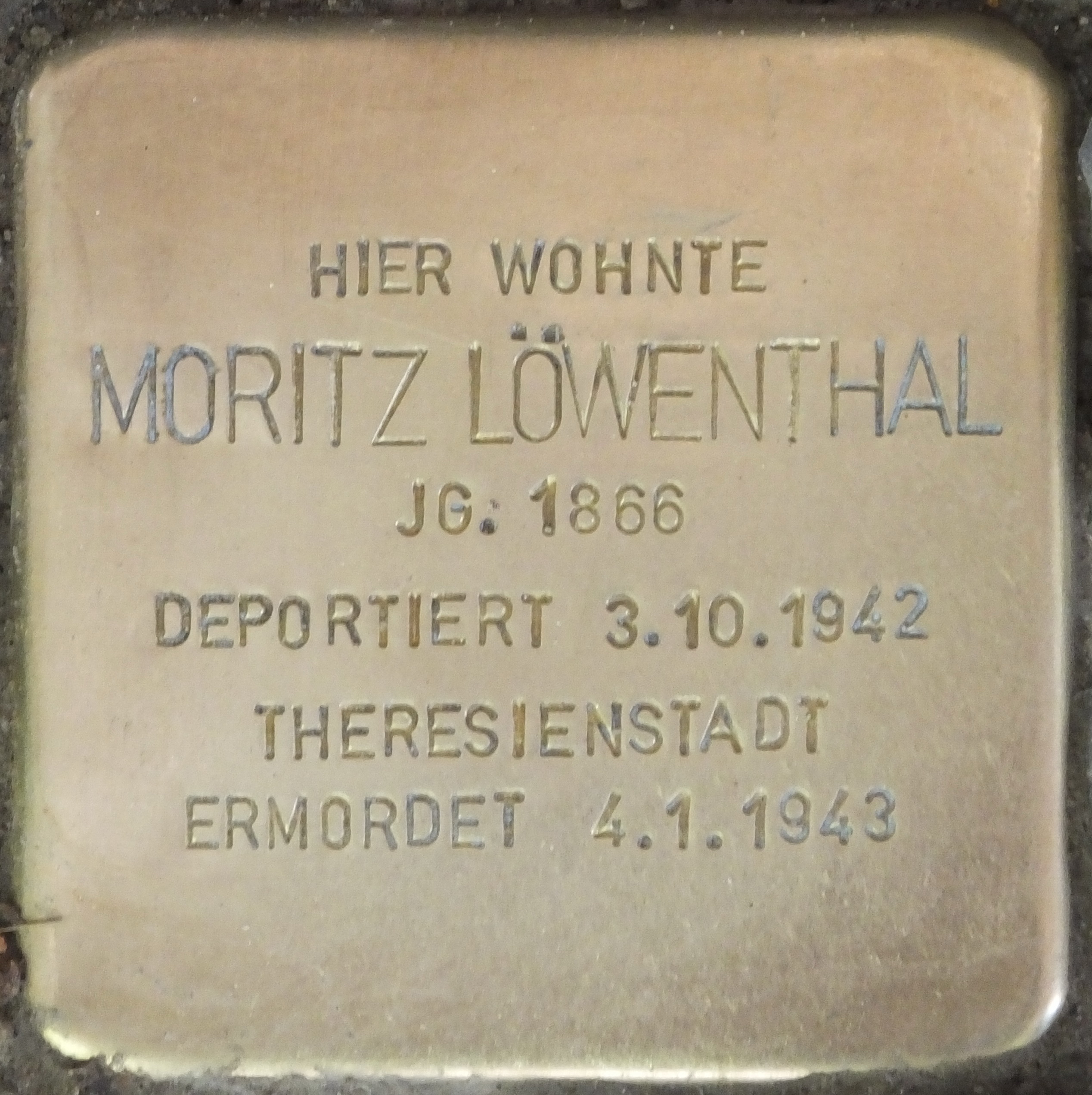Moritz Löwenthal deportierte die Gestapo mit dem „3. großen Alterstransport“ am 3. Oktober 1942 zusammen mit 960 meist älteren Menschen über 65 Jahre in das Ghetto Theresienstadt. Nach drei Monaten starb er mit 76 Jahren am 4. Januar 1943 aufgrund der unmenschlichen, unhygienischen Bedingungen im Ghetto.