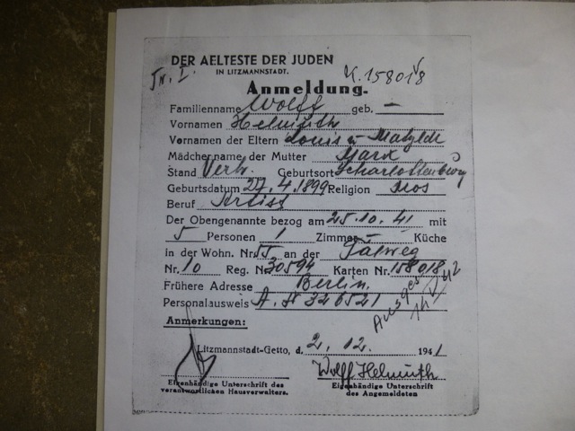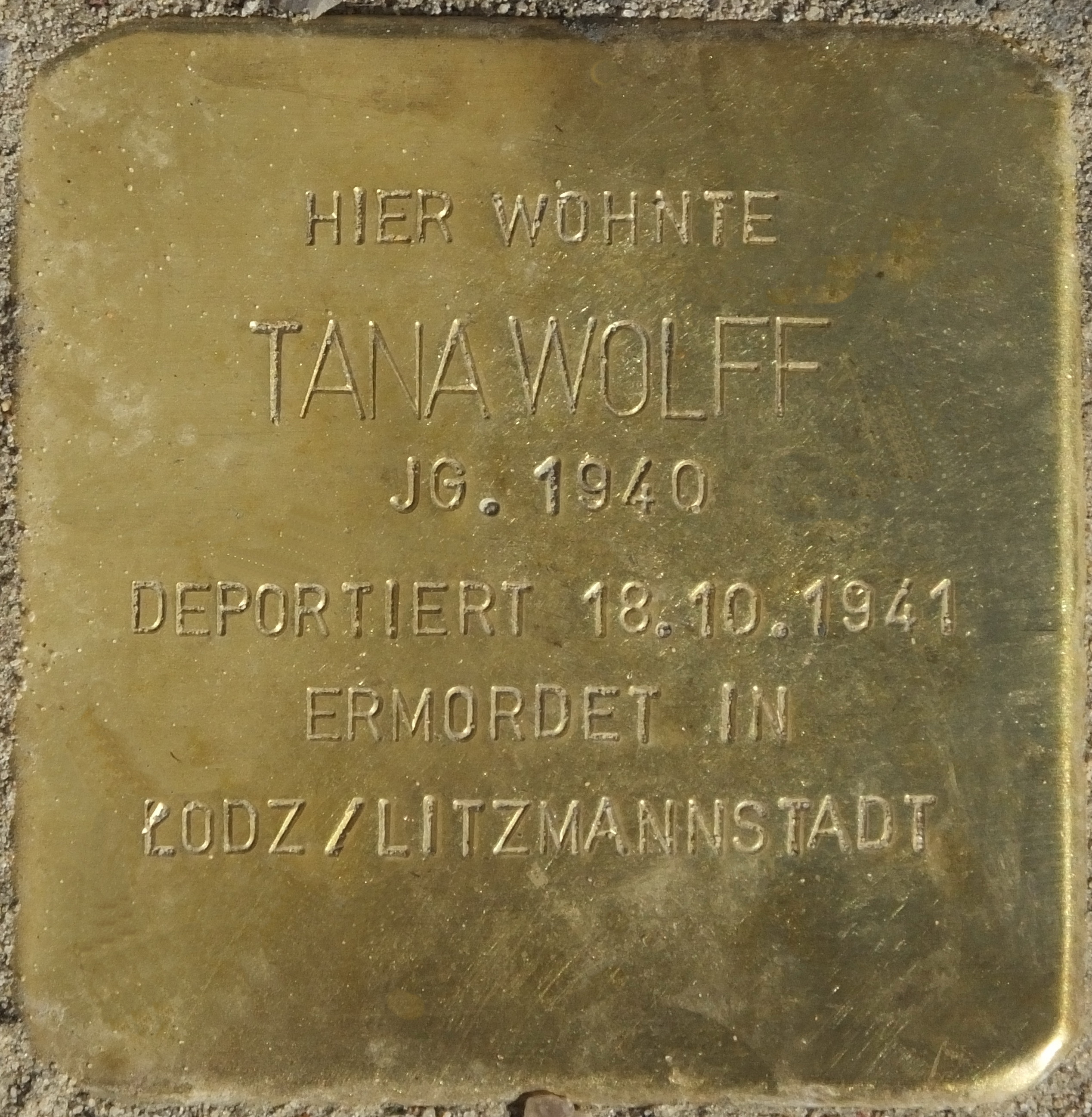 Diese drei Stolpersteine wurden am 8.10.2015 auf Wunsch von Familienangehörigen verlegt. Obwohl die Inschriften bedauerlicherweise nicht korrekt sind (die Familie Wolff wurde 60 Kilometer von Lodz entfernt in Chelmno ermordet), haben die Angehörigen dankenswerterweise auf einen Austausch verzichtet, damit – angesichts der geringer werdenden Anzahl von in Berlin zu verlegenden Stolpersteinen – drei Stolpersteine für Menschen verlegt werden können, derer noch nicht in dieser Form gedacht wird. Die unten stehenden Biografien sind korrekt.