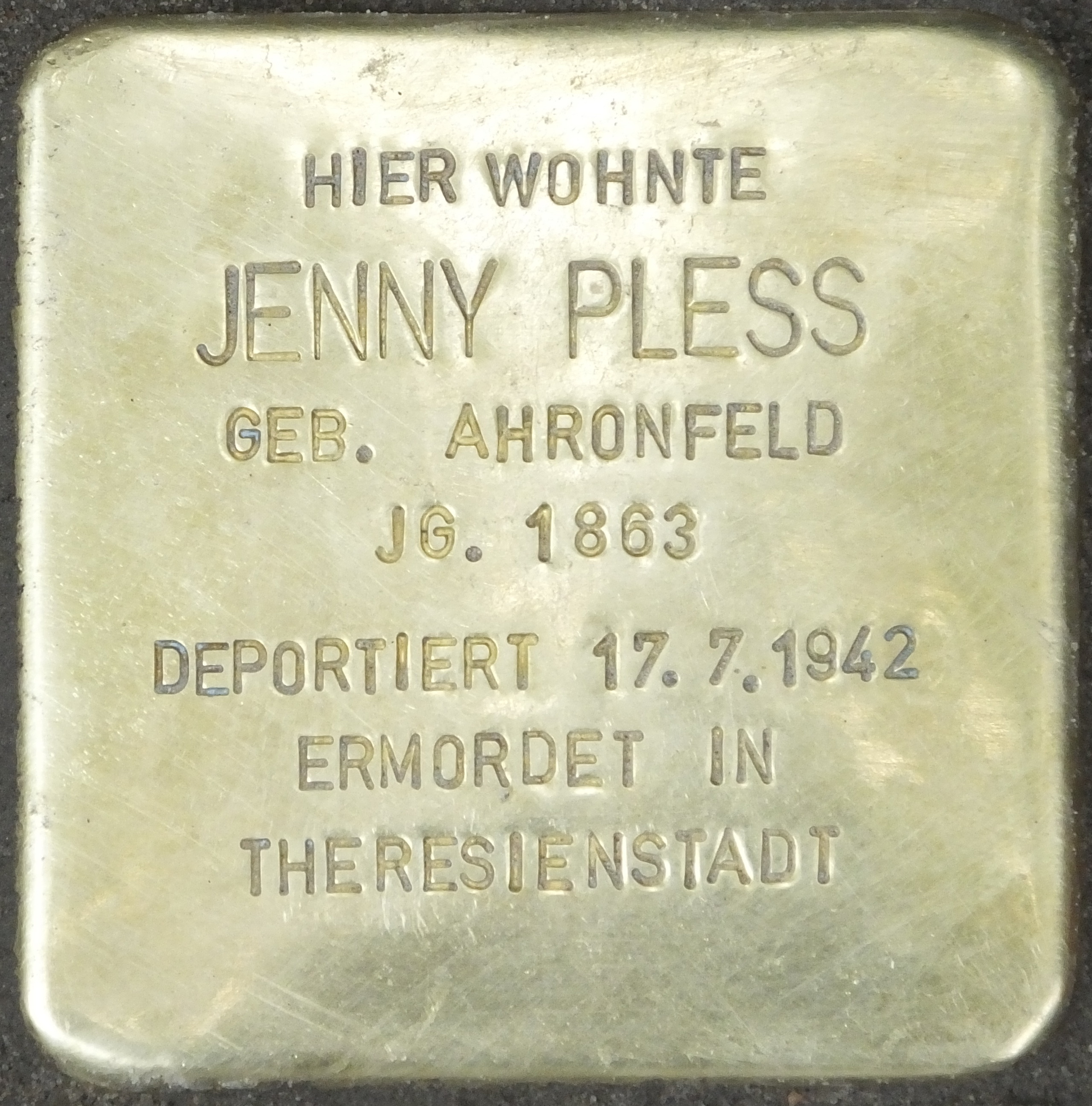 Jenny Pless geb. Ahronfeld ist am 8. September 1863 in Pasewalk (Pommern) geboren. Ihr vollständiger Vorname war Jenny Gerhardine.