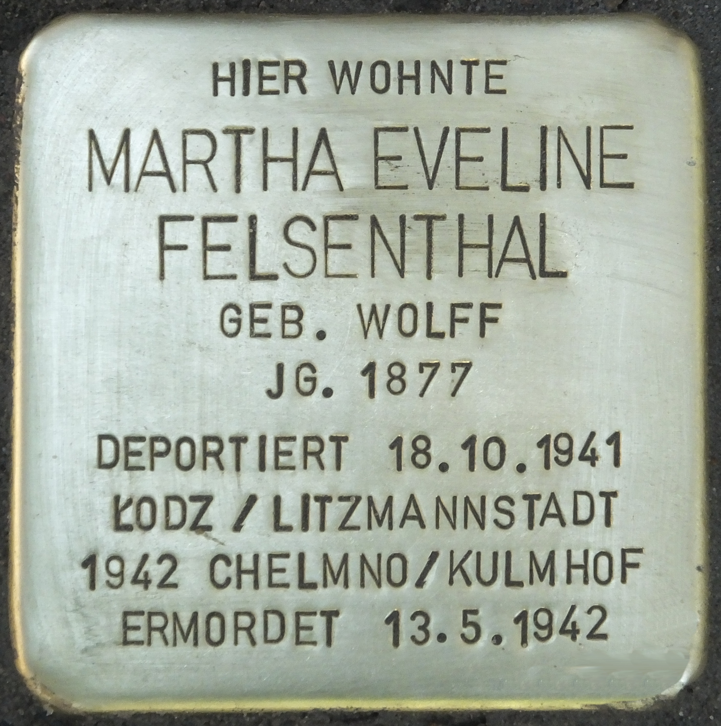 Although the specifics of their disappearance are unknown, Martha and Bruno were eventually abducted from their home. They were deported on the first recorded transport from Berlin on October 18, 1941 to Łódź ghetto in Nazi-occupied Poland. By this time in their lives, the Felsenthals were elderly and their last known residence in Łódź ghetto was at a “Home for the Aged” for the oldest Jews in the ghetto. They were both later deported from Łódź to Chełmno extermination camp on May 13th, 1942. No further information is listed on their fates. May they rest in peace.
