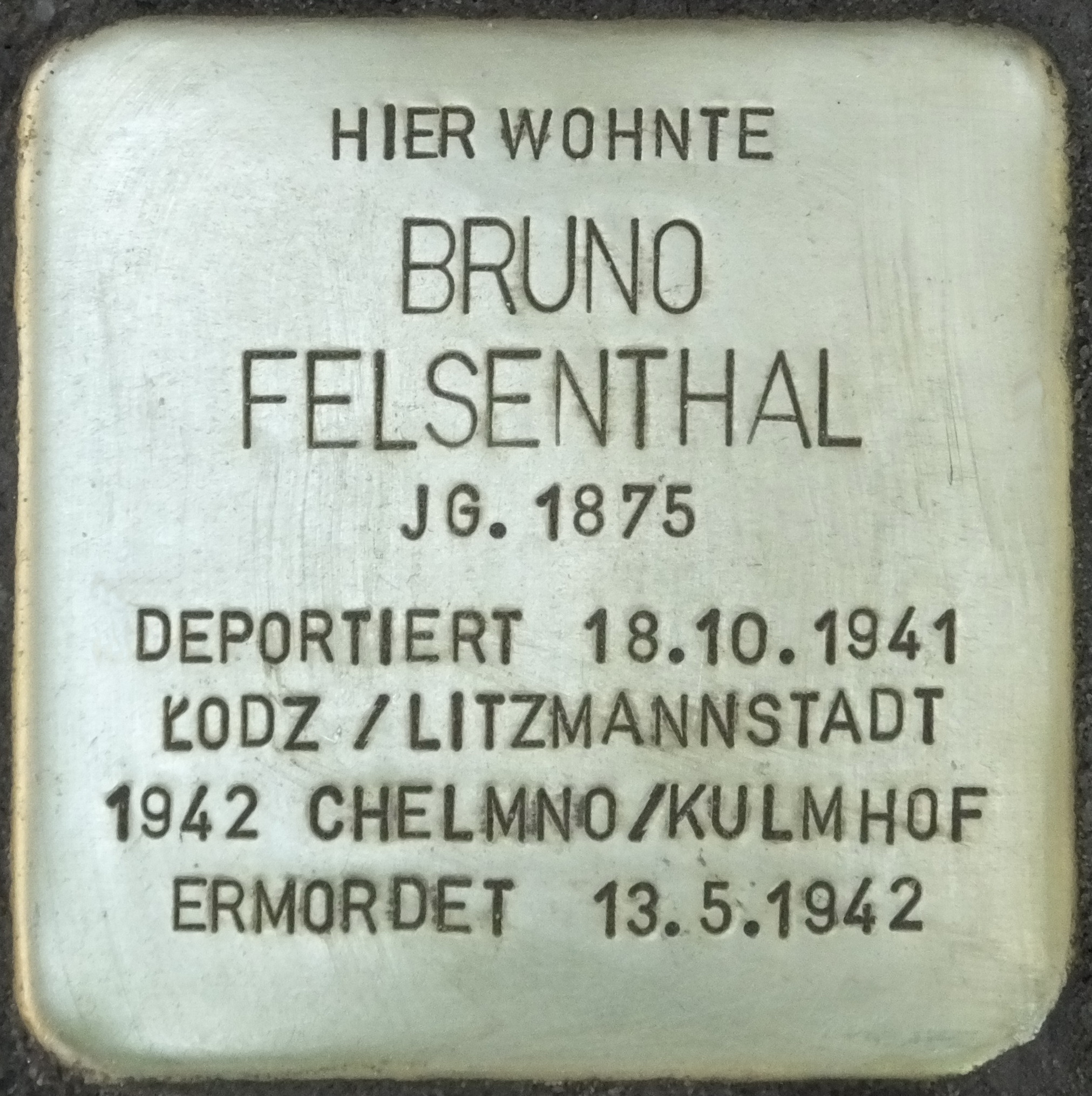 Bruno Felsenthal ist am 9. Oktober 1875 in Aachen geboren. Seine Frau Martha Eveline Felsenthal kam am 7. Juni 1877 in New York zur Welt. Ihre Wohnadresse war die Fasanenstraße 72 in Charlottenburg, ein Haus, das heute noch steht.