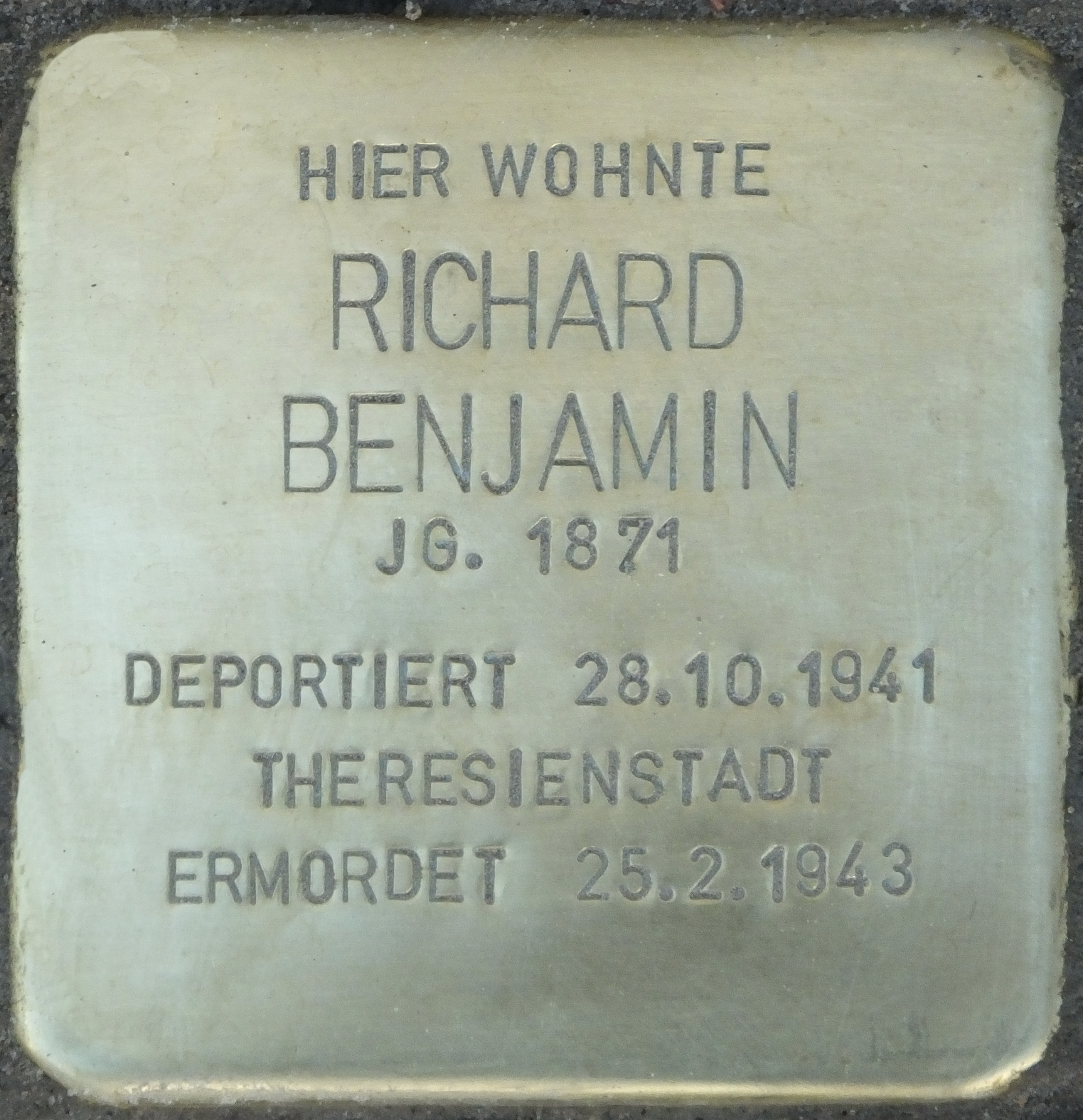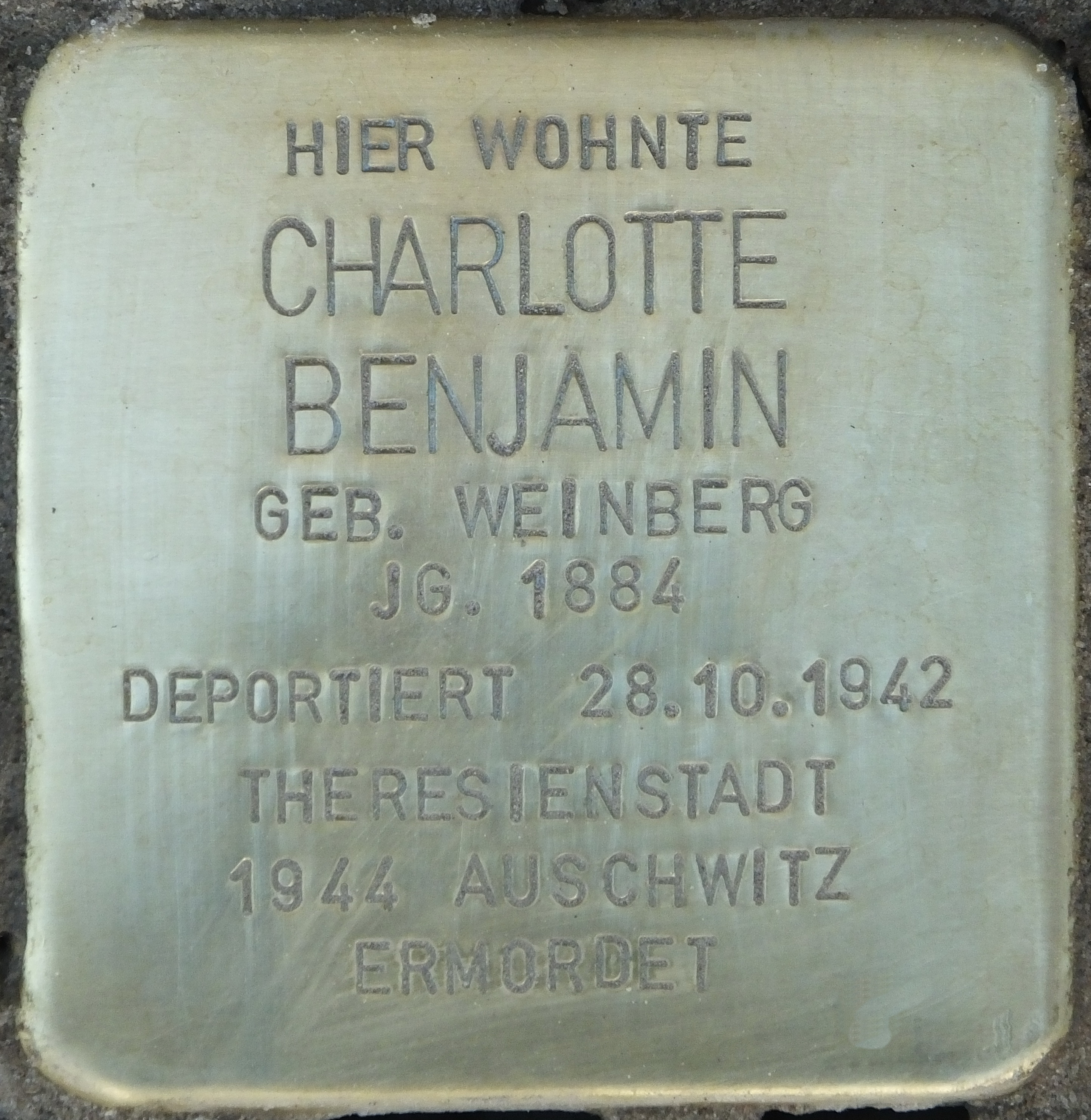 Richard und Charlotte Benjamin wohnten in der Schlüterstraße 16, kurz vor ihrer Deportation wurden sie in die Kantstraße 130 zwangsweise umquartiert. Sie sind zunächst ins Sammellager Große Hamburger Straße 26 gebracht um am 28. Oktober 1942 vom Anhalter Bahnhof nach Theresienstadt deportiert worden. Auf der Deportationsliste stand er als „Behandler“, bei ihr war der Vermerk „Pflegerin“ abgebracht.