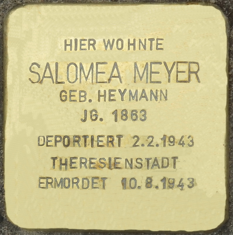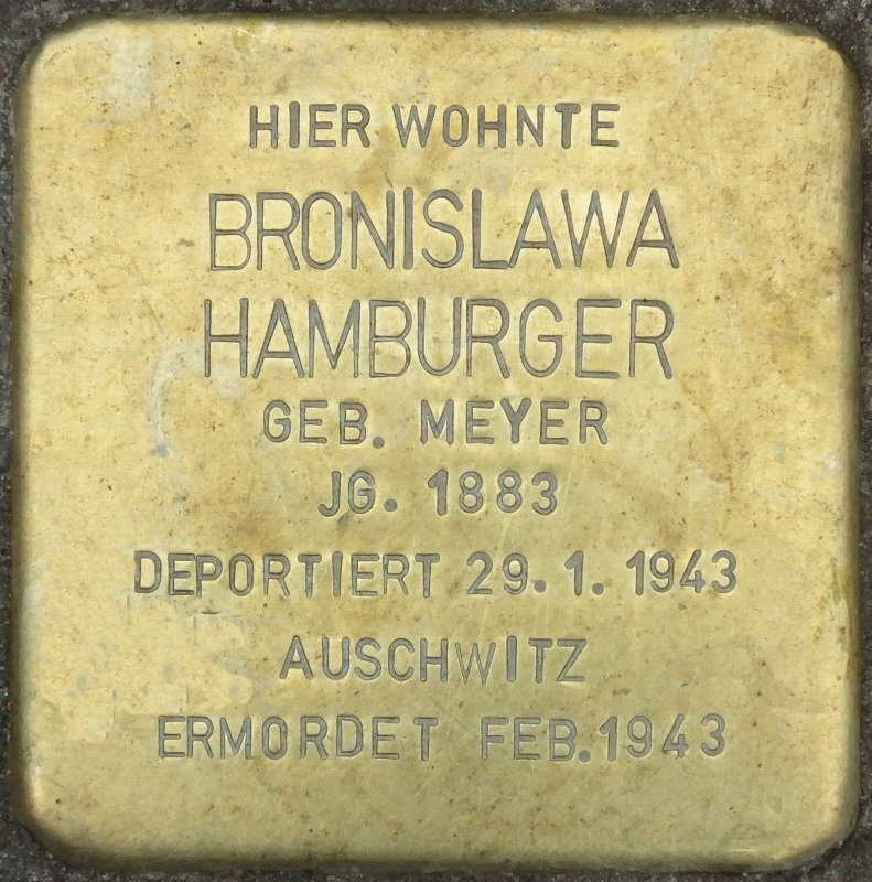 Diese Stolpersteine wurden auf Wunsch von Ulrich „Andy“ Meyer (USA), Enkel von Salomea und Neffe von Bronislawa, sowie seines Neffen Christian Meyer (Heidelberg) am 6. Oktober 2016 in Anwesenheit des letzteren verlegt.