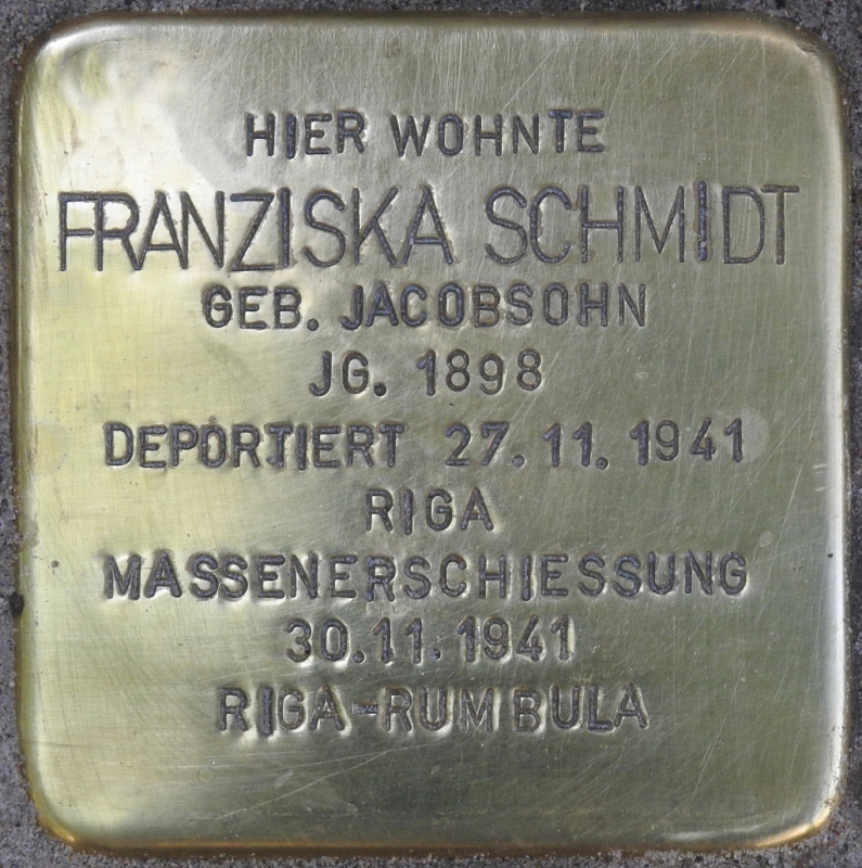Franziska und ihr Sohn Gerd blieben in der Bamberger Straße 8, allen diskriminierenden und entwürdigenden Maßnahmen der Nationalsozialisten ausgesetzt. Im November 1941 wurden beide in die von den Nazis als Sammellager missbrauchte Synagoge in der Levetzowstraße 7-8 gebracht. Am 27. November folgte ihre Deportation nach Riga. Im Gedenkbuch Yad Vashem wird ihr letzter Weg beschrieben:
