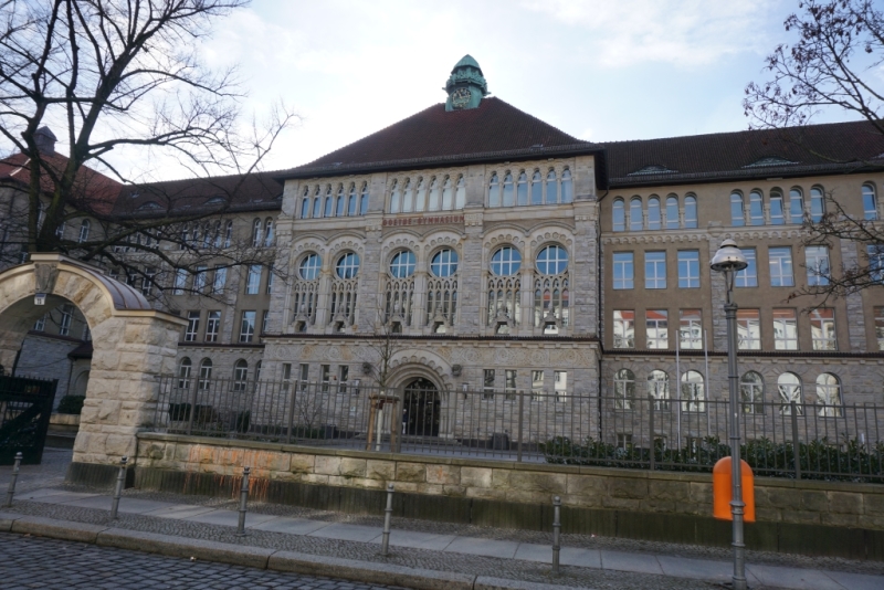 Das Goethe-Gymnasium schräg gegenüber wurde zwischen 1903 und 1904 von Otto Herrnring als Mädchengymnasium erbaut. Es erhielt den Namen Viktoria-Luise-Lyzeum. Viktoria Luise wurde am13. September 1892 als einzige Tochter Kaiser Wilhelms II. und Kaiserin Auguste Viktorias in Potsdam geboren. Den Namen Viktoria erhielt sie nach ihrer Großmutter, der Kaiserin Victoria. Diese schrieb sich übrigens mit c, im Gegensatz zu Viktoria Luise, deren Namen man allerdings auch häufig fälschlicherweise mit c geschrieben findet. Den Namen Luise erhielt sie nach der preußischen Königin Luise. Bereits im Jahr ihrer Einschulung 1899 wurde übrigens in Schöneberg der Viktoria-Luise-Platz nach ihr benannt, 1904 dann das Viktoria-Luise-Lyceum. Sie heiratete 1913 den Herzog Ernst August von Braunschweig und starb 1980 in Hannover. Ihre Tochter Friederike wurde Königin von Griechenland.