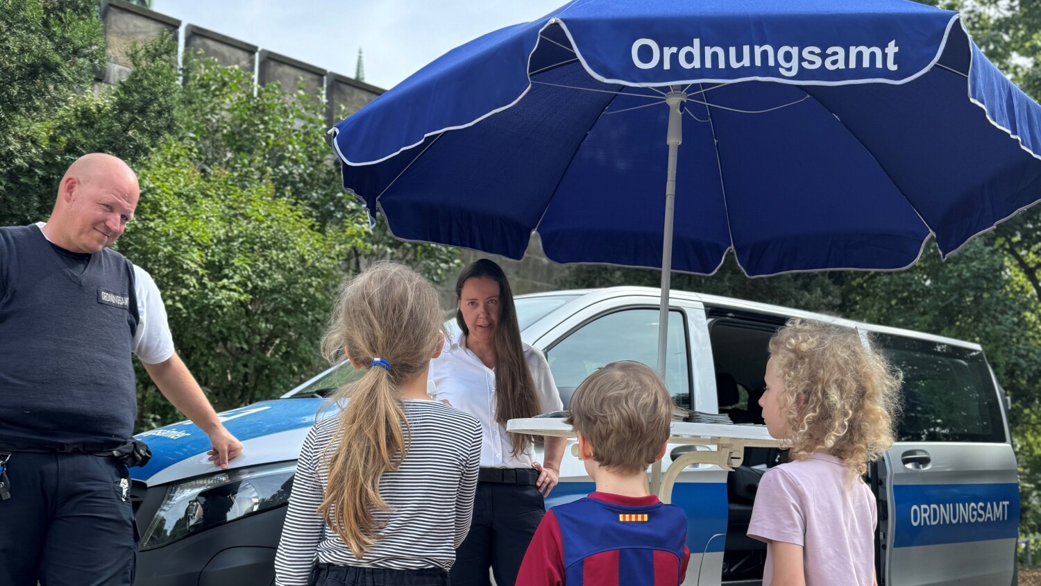 Besonders Kinder zeigten sich von den uniformierten Mitarbeiter*innen des Ordnungsamtes beeindruckt und freuten sich über das Pixibuch „Lotta und Amir sorgen für Ordnung“, das die Arbeit des Ordnungsamtes anschaulich und kindgerecht erklärt, welche Aufgaben das Ordnungsamt in der täglichen Arbeit wahrnimmt.