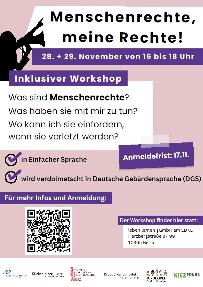 Der Bezirk Lichtenberg wird in diesem Jahr erstmals vom 20. November bis zum 15. Dezember 2023 Aktionswochen zum internationalen Tag der Menschenrechte ausrichten. Der Tag wird jährlich am 10. Dezember begangen. Die Allgemeine Erklärung der Menschenrechte (AEMR) wird dieses Jahr 75 Jahre alt. Sie wurde am 10. Dezember 1948 von der Generalversammlung der Vereinten Nationen (UN) in Paris verabschiedet. Innerhalb der Aktionswochen sollen durch verschiedene Aktivitäten Aufmerksamkeit für Betroffene prekärer Menschenrechtslage geschaffen werden – ebenso für den Schutz und die Achtung der Menschenrechte weltweit. Ein besonderes Augenmerk wird in diesen Wochen auf das Thema Kinderrechte, Pflege von Angehörigen, Aktionen gegen Gewalt an Frauen, Integration von Menschen mit Behinderungen in den ersten Arbeitsmarkt und auf LSBTIQ+ Rechte liegen.