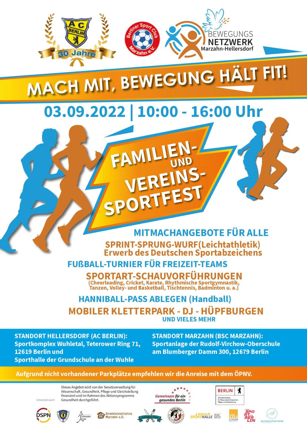 Am Samstag, dem 3. September 2022, von 10:00 bis 16:00 Uhr, feiern der Bezirkssportbund (BSB) und die Vereine Marzahn-Hellersdorfs unter dem Motto „Mach mit, Bewegung hält fit!“ das Familien- und Vereinssportfest an zwei Standorten: Im Sportkomplex Wuhletal und auf der Sportanlage am Blumberger Damm 300.