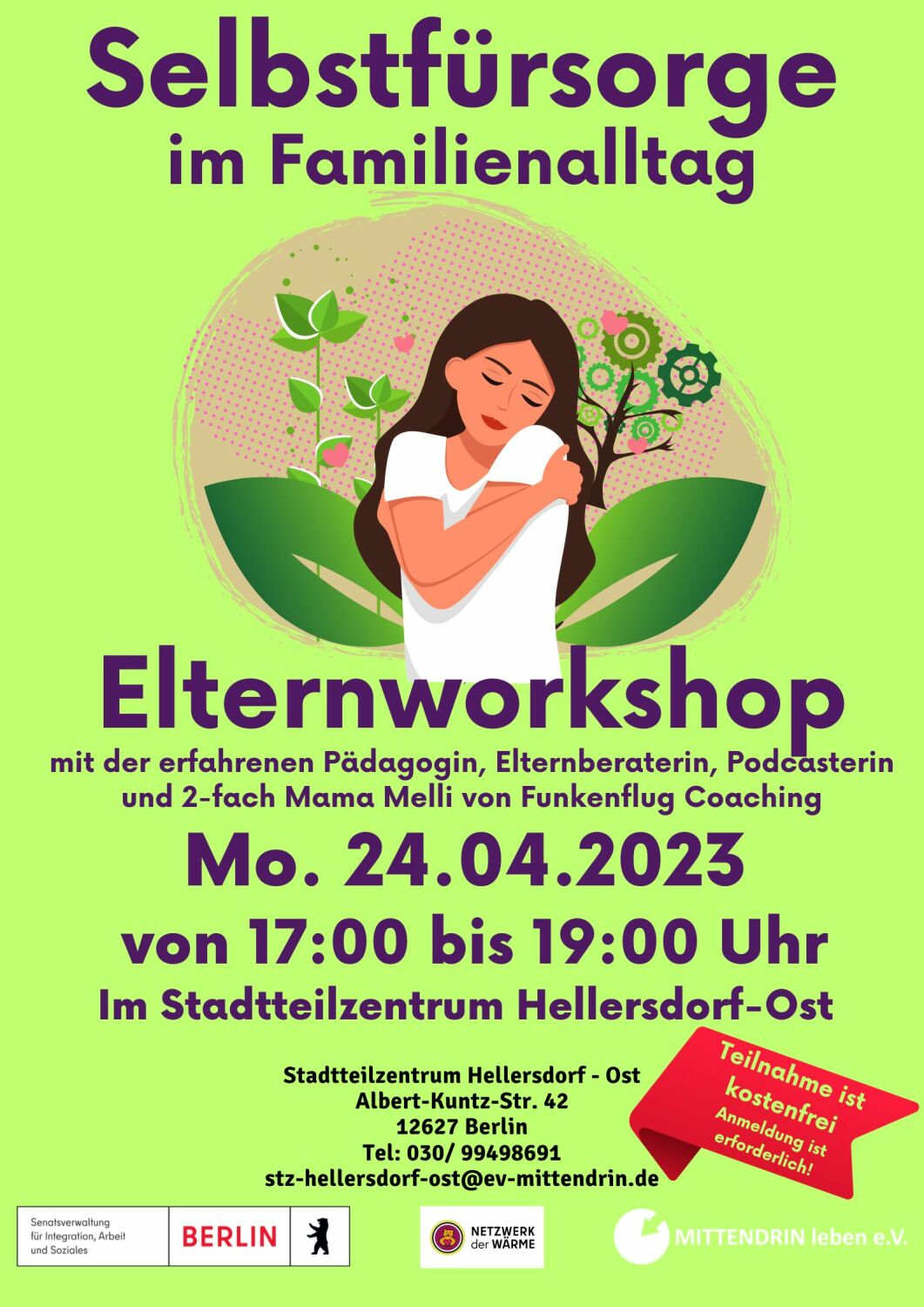 Am Montag, dem 24. April 2023, um 17:00 Uhr, lädt das Stadtteilzentrum Hellersdorf Ost ein zu einem Elternworkshop zum Thema „Selbstfürsorge im Familienalltag“ mit der erfahrenen Pädagogin, Elternberaterin, Podcasterin und zweifache Mama Melli von “Funkenflug Coaching”.