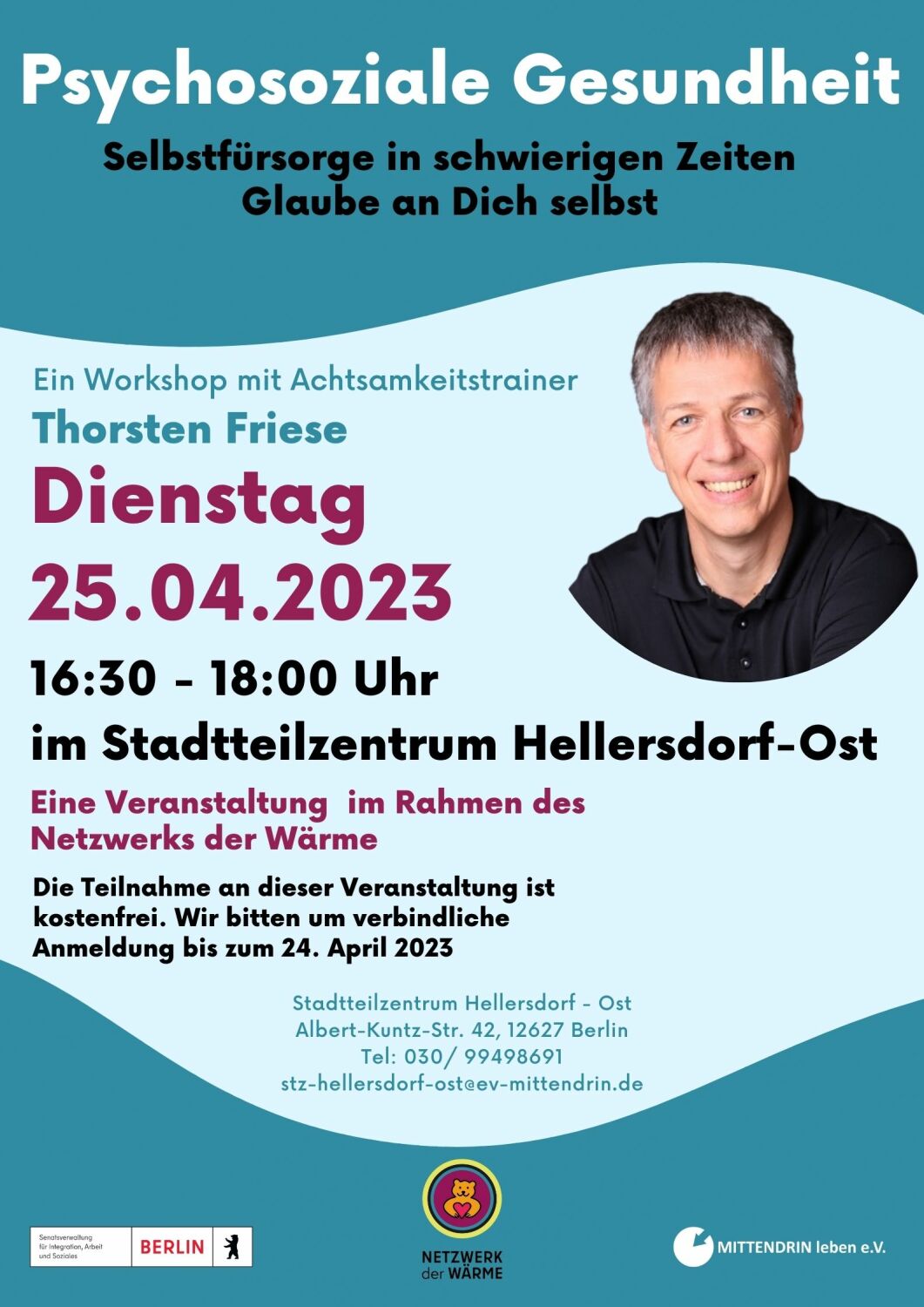 Am Dienstag, dem 25.April 2023, von 16:30 bis 18:00 Uhr, lädt das Stadtteilzentrum Hellersdorf-Ost, Albert-Kuntz-Straße 42, zu einer Veranstaltung zum Thema „Selbstfürsorge in schwierigen Zeiten“ ein. Der erfahrene Achtsamkeitstrainer und zertifizierte MBSR-Lehrer Thorsten Friese bietet im Rahmen seines Workshops „Selbstfürsorge – Glaube an Dich selbst“ praktische Hilfestellung zur Bewältigung von Konflikten, Stress und Niederlagen an. Die Stärkung der seelischen Widerstandskraft durch Aktivierung der persönlichen Ressourcen und das Bewahren einer positiven Grundhaltung ist das Ziel des Workshops.