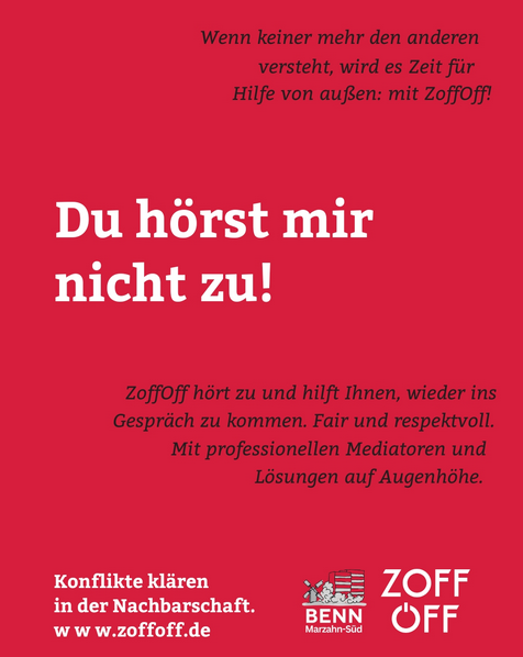 Die Beratung findet in Zusammenarbeit mit BENN Marzahn-Süd entweder im BENN-Büro oder an einem anderen Wunschort im BENN-Gebiet statt. Ziel ist es, gemeinsam Lösungen zu finden, statt weiter zu streiten.