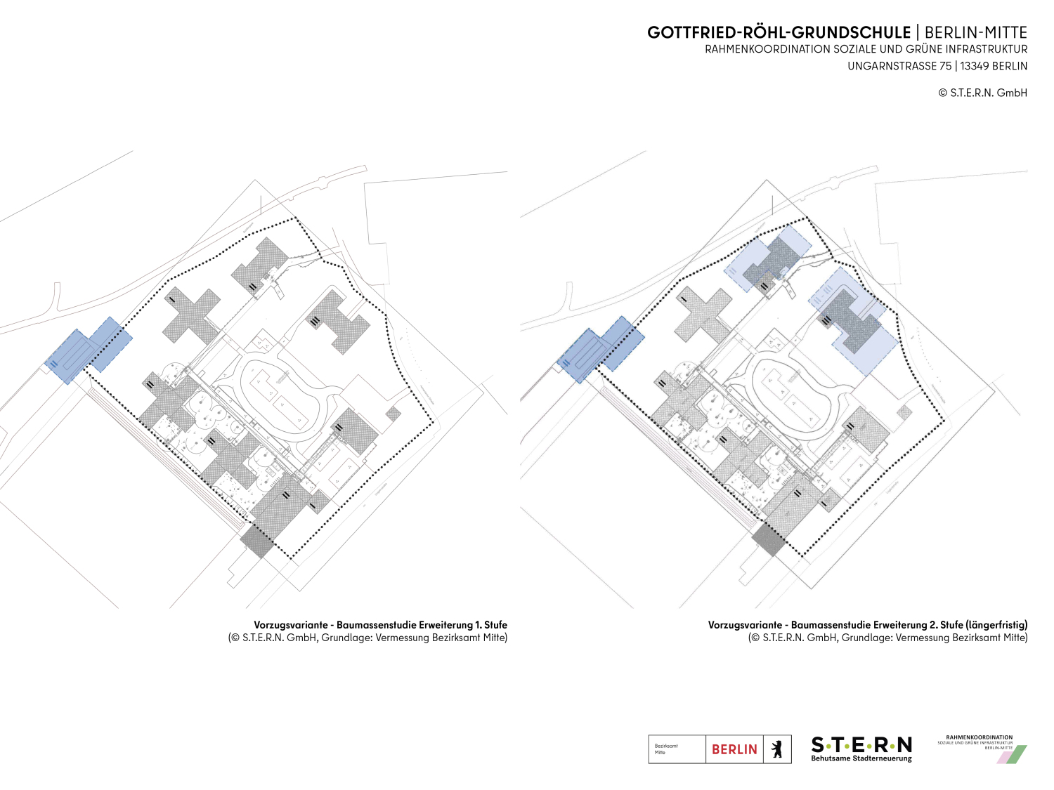 Im Kontext der anstehenden umfänglichen Sanierung der Schulanlage hat das Bezirksamt die Rahmenkoordination/S.T.E.R.N. mit der Prüfung der baulichen Erweiterung der Schule beauftragt. Die Untersuchung wurde in Abstimmung mit dem Schul- und Sportamt, der Stadtplanung und dem Denkmalamt durchgeführt. Die Vorzugsvariante sieht den Neubau eines zusätzlichen Compartment-Gebäudes auf der westlichen Grenze des Schulgrundstücks vor.