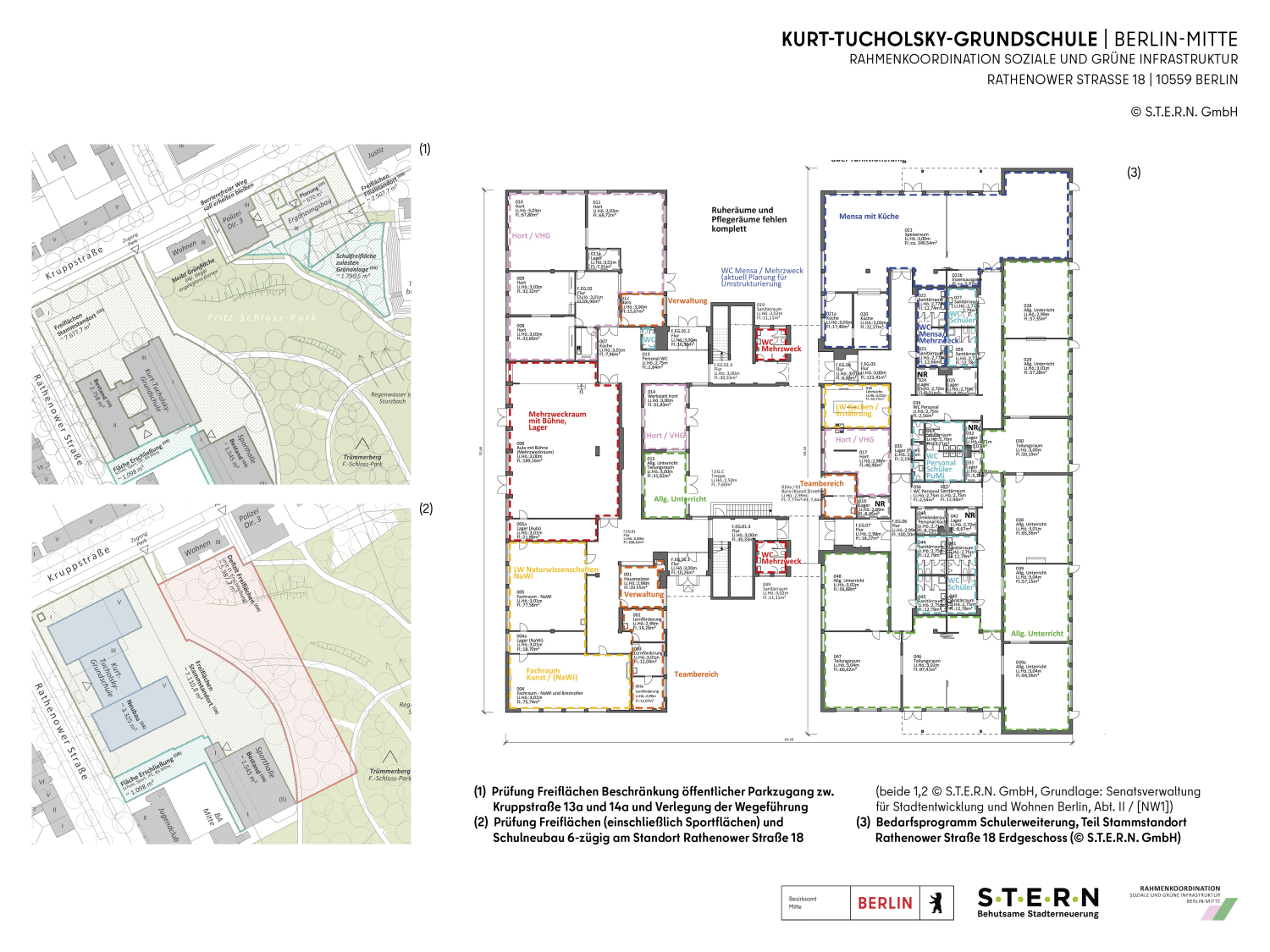 Die Kurt-Tucholsky-Grundschule an der Rathenower Straße 18 befindet sich in der Bezirksregion Moabit Ost, die mit der Entstehung der Neubauquartiere Lehrter Straße/Heidestraße einen hohen Bevölkerungszuwachs verzeichnet. Dem entsprechend plant der Bezirk Mitte die Erweiterung der Kurt-Tucholsky-Grundschule von derzeit 4,5 Zügen auf 6 Züge. Die zusätzlichen Kapazitäten werden auf dem Filialstandort Kruppstraße 14a/b realisiert.