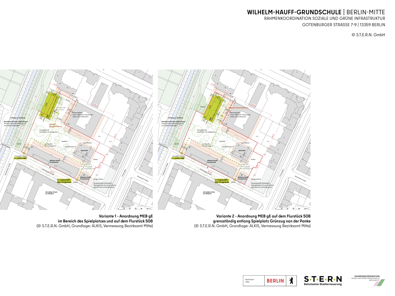 Die Wilhelm-Hauff-Grundschule ist in der Schulplanungsregion Osloer Straße gelegen. Für die Ergänzung des Schulstandorts um den Förderschwerpunkt geistige Entwicklung bietet das nördlich angrenzende, im öffentlichen Eigentum befindliche und unbebaute Flurstück 508 die Möglichkeit, die dafür notwendige Flächenerweiterung umzusetzen. Das Bezirksamt Berlin Mitte hat die Rahmenkoordination / S.T.E.R.N. 2020 beauftragt, Varianten zur Positionierung eines Modularen Ergänzungsbaus MEB gE zu untersuchen.