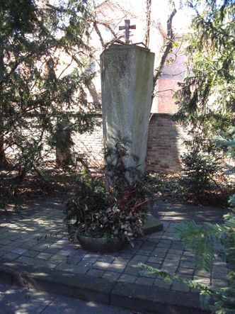 | Bemerkungen: | Die Muschelkalk-Stele ziert ein Bronzekreuz, Auf drei Seiten der sechsseitigen Säule befinden sich Reliefs mit Dornenranken und Stacheldraht, Weiter befinden sich Jahreszahlen, ein Kleeblatt und die Symbole Alpha und Omega auf der Stele, |