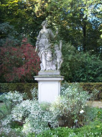 Bemerkungen: | Weibliches Standbild mit Putto "Flora" ("Pomona") auf Sockel, 1796 ursprünglich am Floraplatz aufgestellt. Das stark geschädigte Original wurde bereits in den 1970er Jahren in einen geschützten Innenraum verbracht und 1977 durch eine Sandsteinkopie mit neuem Standort im Rosengarten ersetzt. Der Originalsockel blieb ungeschützt auf einer Lichtung östlich der Hofjägerallee. |