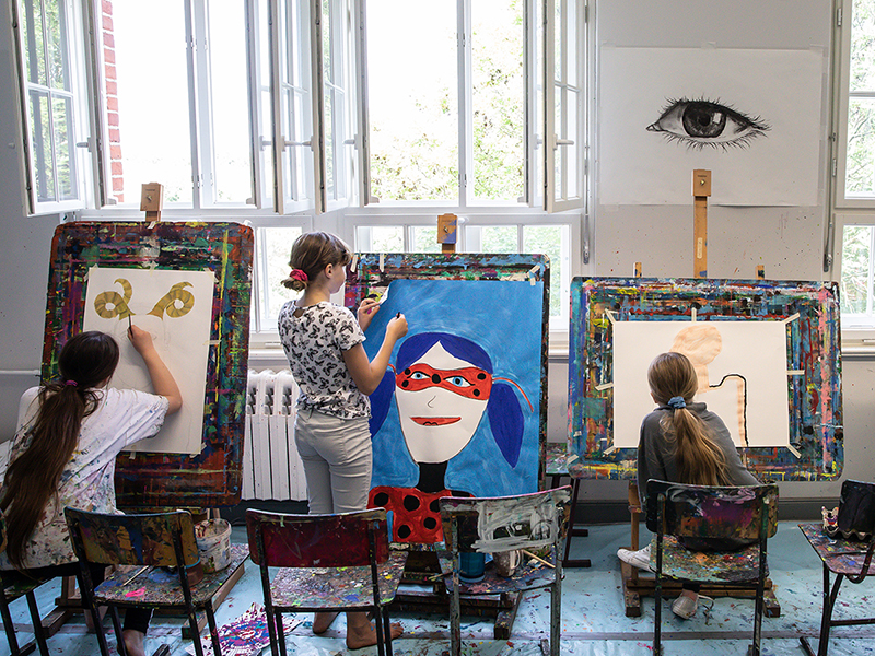 Hier könnt ihr eure Träume und Erlebnisse ohne vorgegebene Themen auf’s Papier bringen. Ihr malt auf großem Papier an der Staffelei oder auf dem Boden, wie es euch gefällt.