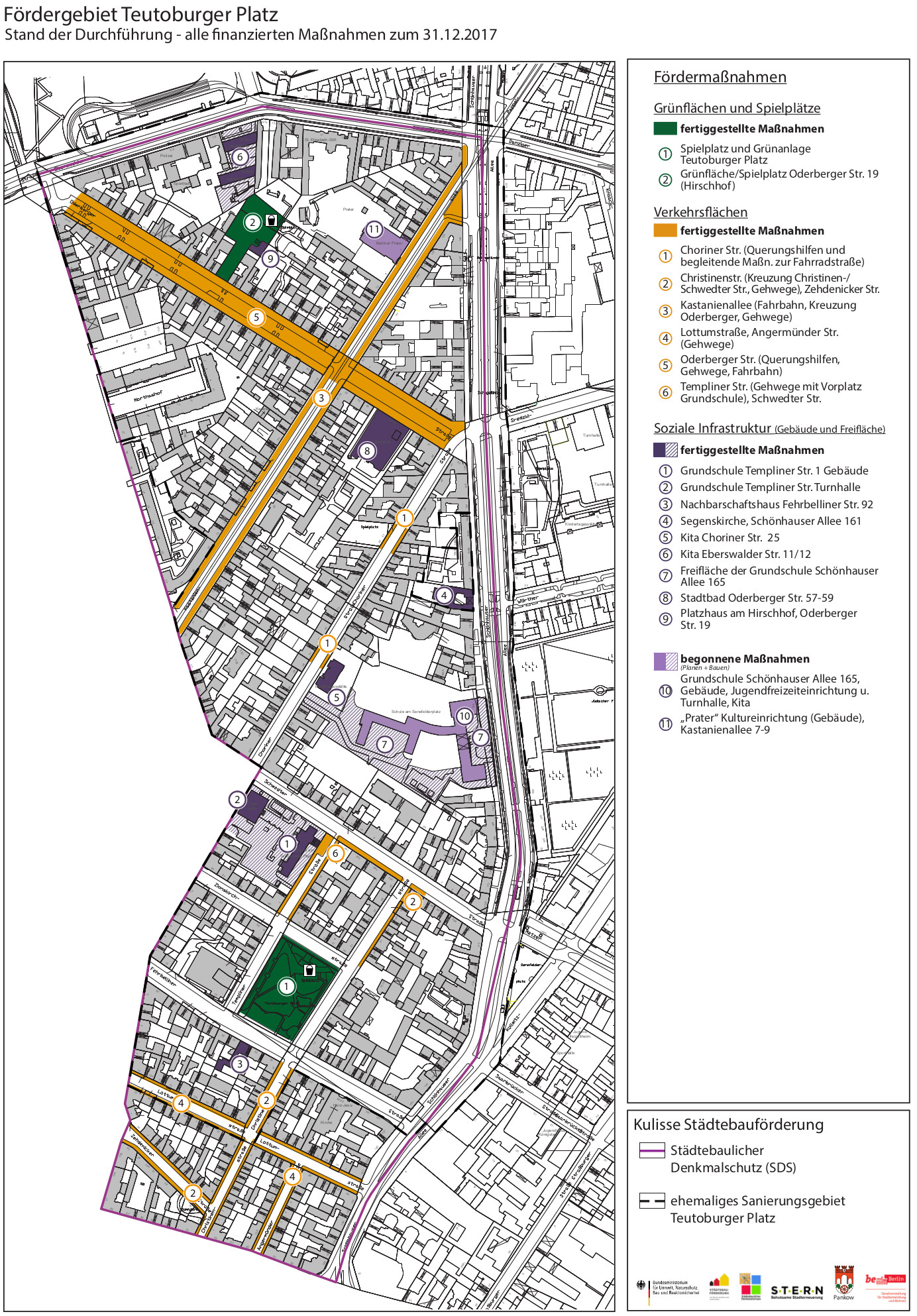 Der Durchführungsstand der Maßnahmen ist inzwischen weit fortgeschrittenen und deutlich wahrnehmbar. In den kommenden Jahren werden daher nur noch vereinzelte Projekte fertiggestellt. Neben den beiden Spielplätzen in der Choriner Straße betrifft dies noch den Prater einschließlich seiner Außenanlagen.