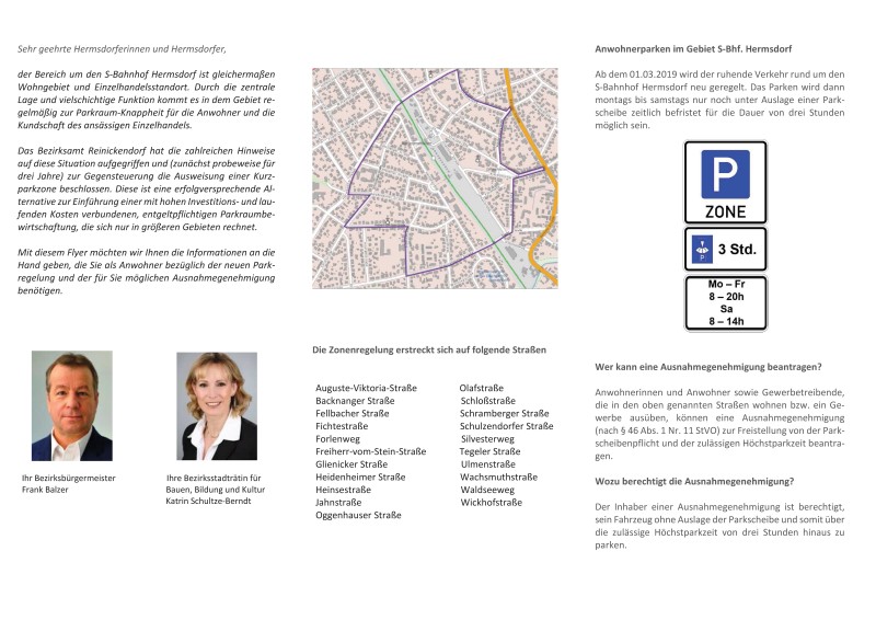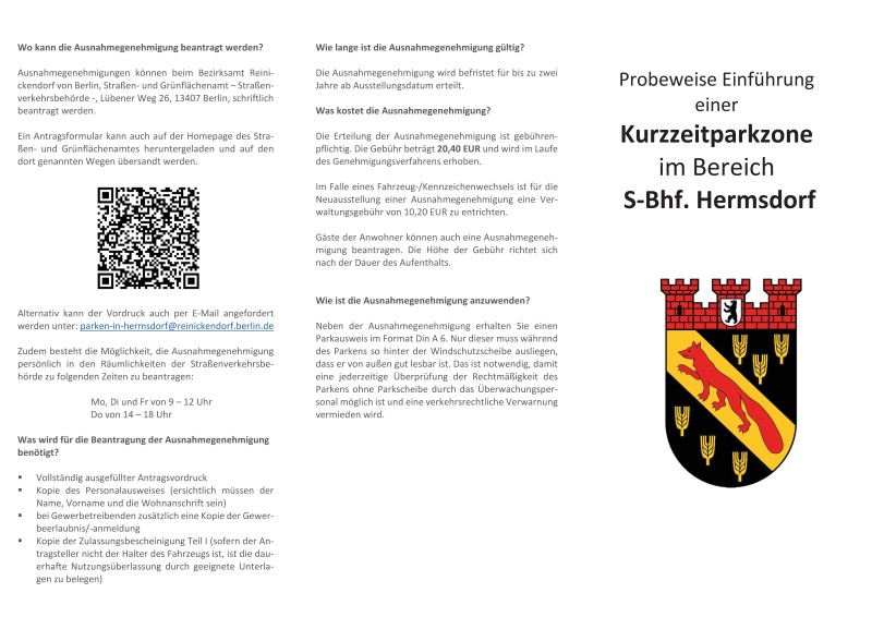 Der Bereich um den S-Bahnhof Hermsdorf ist gleichermaßen Wohngebiet und Einzelhandelsstandort. Durch die zentrale Lage und vielschichtige Funktion kommt es in dem Gebiet regelmäßig zur Parkraum-Knappheit für die Anwohner und die Kundschaft des ansässigen Einzelhandels.