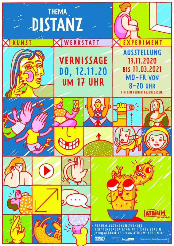 Insgesamt 160 künstlerisch interessierte Schülerinnen und Schüler aller Berliner Bezirke werden in der ersten Woche nach den Herbstferien, vom 26. bis 30. Oktober 2020, im Rahmen von „Kunst Werkstatt Experiment“ (KWE) zum Thema „Distanz“ arbeiten. Dieses Thema soll dabei nicht nur im Lichte der aktuellen Corona-Pandemie betrachtet werden. Auch die Distanz zu Orten, Welten und Galaxien kann eine Rolle spielen, genauso wie soziologische und emotionale Fragen zum Umgang miteinander und der Natur. Die Jugendlichen können frei wählen, was sie herstellen möchten. Das können Bilder, Grafiken, Performances, Installationen, Fotografien, Tänze, Kostüme, Videos, Skulpturen, Texte und vieles mehr sein. Die Ergebnisse werden in einer Ausstellung vom 13. November 2020 bis zum 11. März 2021 in der Jugendkunstschule ATRIUM, am Senftenberger Ring 97, gezeigt.