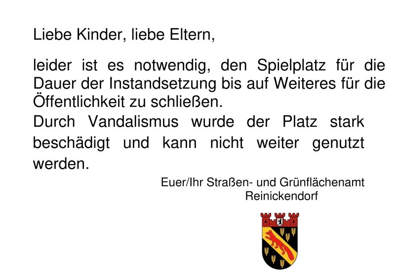 Die Täter nehmen den Kindern die Möglichkeit zum Spielen im Freien. Leider sei es notwendig, den Spielplatz für die Dauer der Instandsetzung bis auf Weiteres für die Öffentlichkeit zu schließen. Es wurde Anzeige erstattet.