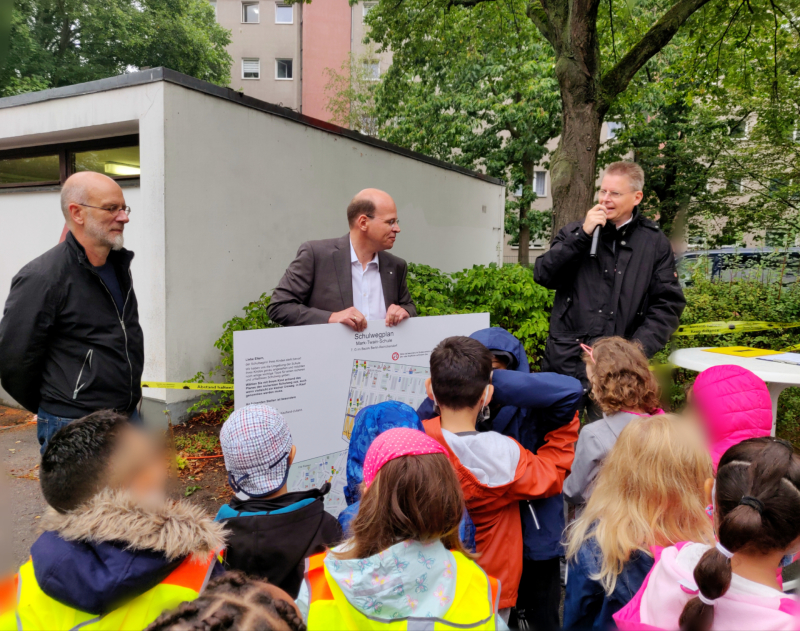 Zu den Aktionstagen werden die aktualisierten Schulwegpläne offiziell an die Grundschulen übergeben – gesponsert von der Berliner Sparkasse. Schulstadtrat Tobias Dollase (parteilos, für CDU) überreichte am Abschlusstag den neuen Schulwegeplan im Großformat persönlich an die Schülerinnen und Schüler der Mark-Twain-Grundschule. Ebenfalls dabei waren Frank Schröter, der Direktor der Berliner Sparkasse Reinickendorf, Harald Petters, der Reinickendorfer Schulberater für Verkehrserziehung der Senatsverwaltung für Bildung, Jugend und Familie sowie Heiko Weiß von der CÖGA Gesellschaft für Arbeitsförderung mbH, die die Pläne erstellt und jährlich aktualisiert.