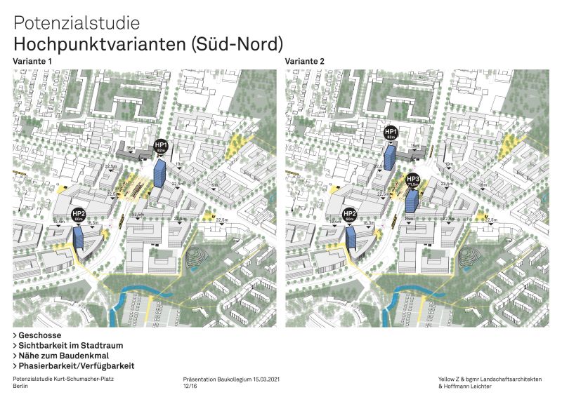 Überlegungen zu einer möglichen Hochhausbebauung am Platz waren Anlass für den Bezirk, sich zur Beratung an das Baukollegium zu wenden. Im Ergebnis der Videokonferenz schätzte das Baukollegium den Kurt-Schumacher-Platz als geeignet für eine Hochhausbebauung ein und gab dem Bezirk Empfehlungen und Anregungen für die neu zu entwickelnden Platz- und Freiflächen. Die Potenzialstudie wird nun auf dieser Grundlage weiterentwickelt und erneut mit dem Baukollegium diskutiert. Im Anschluss ist eine öffentliche Abschlusspräsentation geplant. Der Bezirk wird zudem ein Bebauungsplanverfahren starten, um eine Neubebauung des Einkaufszentrums CLOU vorzubereiten.