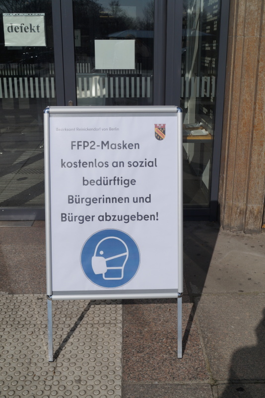 Das Bezirksamt Reinickendorf verteilt kostenfrei FFP2-Schutzmasken an bedürftige Personen mit geringem Einkommen.