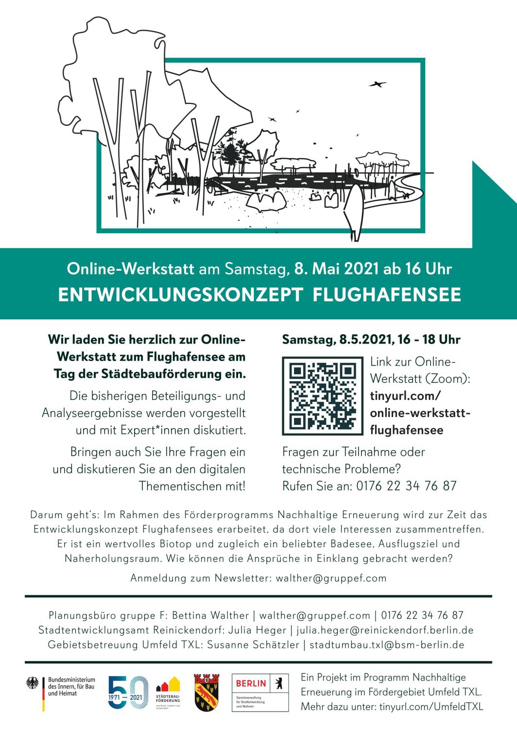 Die Bürgerwerkstatt findet coronabedingt als Videokonferenz (über Zoom) am Samstag, den 8. Mai 2021 von 16 bis 18 Uhr statt. Teilnehmen können Sie unter: tinyurl.com/online-werkstatt-flughafensee. Nähere Informationen zum Ablauf und eine Anleitung zur Teilnahme finden Sie unter: tinyurl.com/anleitung-flughafensee.