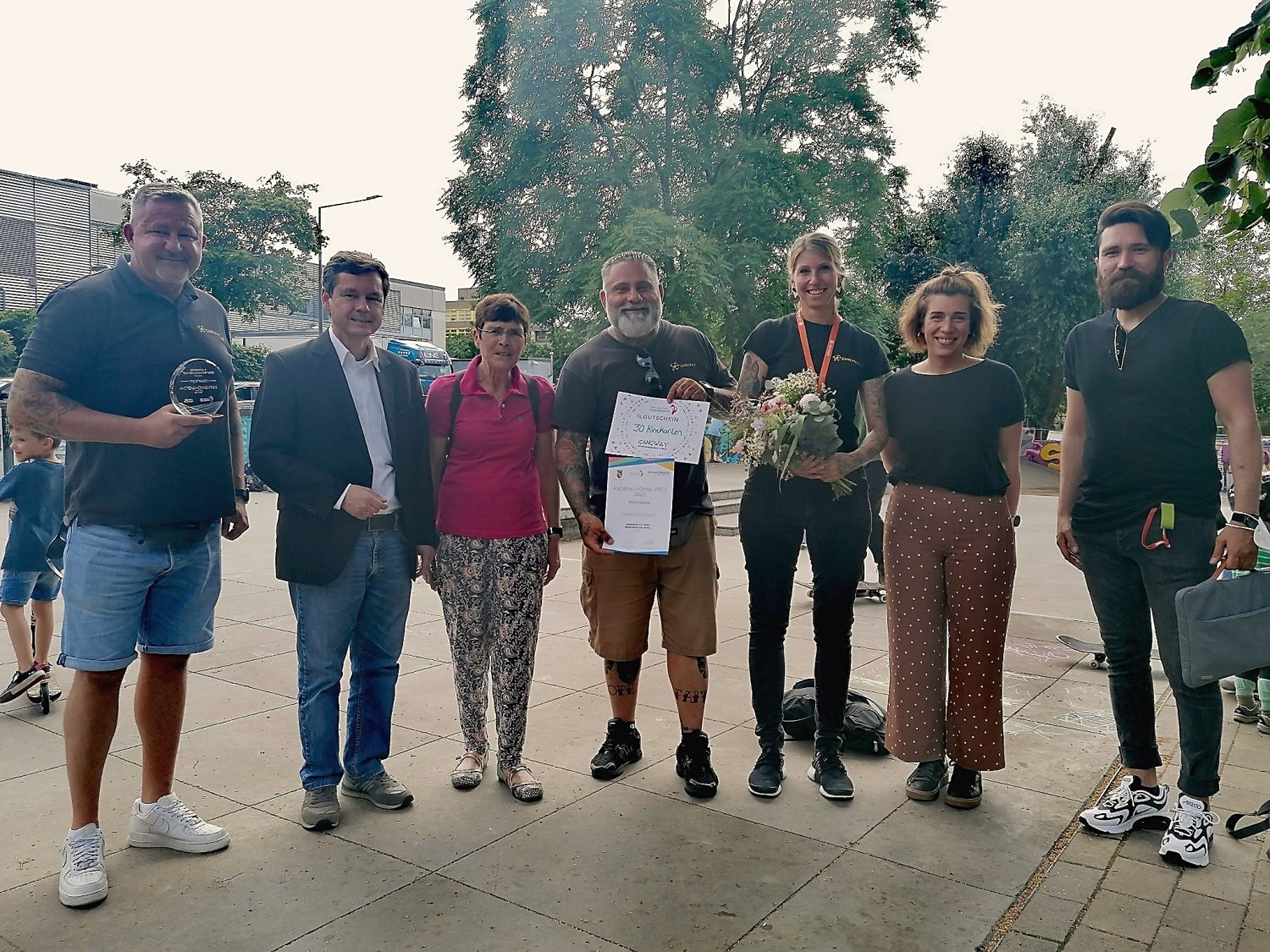 Am 2. Juli 2021 konnte nun der Preis in Form eines Pokals, einer Urkunde sowie 30 Kinogutscheinen für die im Projekt beteiligten Kinder und Jugendlichen vor Ort auf dem Skatepark an das Team stellvertretend für alle beteiligten Kinder und Jugendlichen übergeben werden. Bei strahlendem Sonnenschein und viel Jubel und Applaus überreichten Bezirksstadtrat Uwe Brockhausen (SPD) und Frau Hiller-Ewers als Vorsitzende des Integrationsausschusses den Preis an das Team Reinickendorf Nord von Gangway. Weitere Glückwünsche wurden von Fr. Schubert (Linke, AGH) überbracht, die das Teams für den Preis vorschlug.