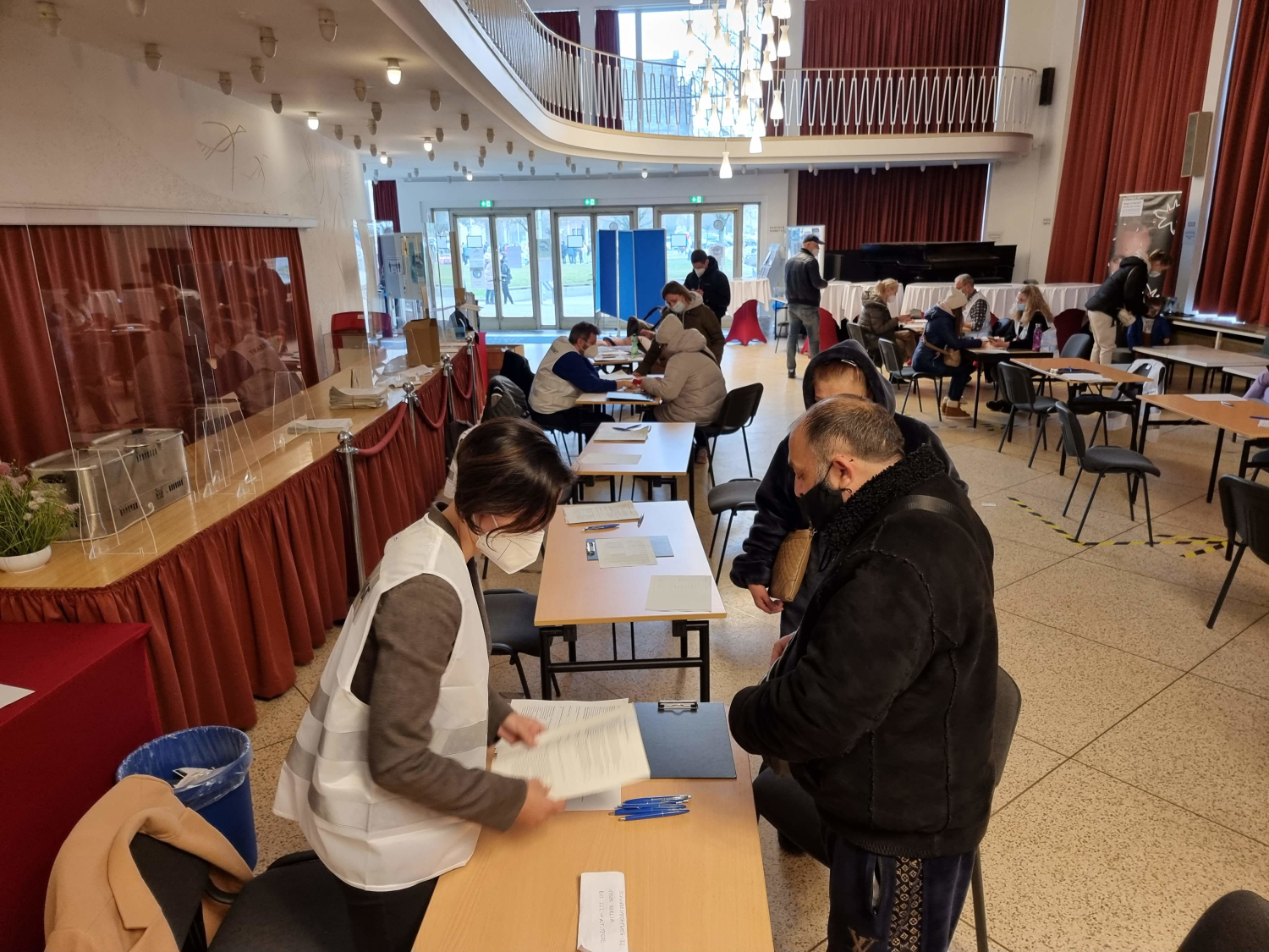 Derzeit kommen täglich etwa 200 Menschen zum Rathaus Reinickendorf – Tendenz steigend. Um lange Schlangen in den Fluren des Rathauses zu vermeiden und die geflüchteten Menschen bestmöglich zu unterstützen, wurde für die Aufnahme der Anträge kurzerhand das Foyer im Ernst-Reuter-Saal neben dem Rathaus geöffnet und mit Tischen, Stühlen und Kopierern hergerichtet. Das Amt für Soziales wird dabei von Kolleginnen und Kollegen aus anderen Ämtern unterstützt, die sich freiwillig gemeldet haben – darunter auch viele mit ukrainischen und russischen Sprachkenntnissen.