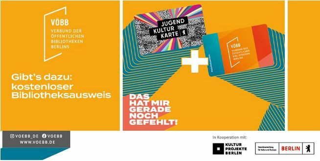 Noch bis 28. Februar können sich alle 18- bis 23-jährigen Berlinerinnen und Berliner die JUGENDKULTURKARTE in mehr als 40 Berliner Bibliotheken abholen. Nach einer Online-Registrierung auf www.jugendkulturkarte.berlin kann die Karte an folgenden Standorten der Stadtbibliothek Reinickendorf abgeholt werden: Humboldt-Bibliothek in Tegel, Stadtteilbibliothek Reinickendorf-West und Bibliothek im Märkischen Viertel. „Obendrauf gibt es den Bibliotheksausweis gratis dazu. Mit ihm kann das gesamte Angebot aller Berliner Bibliotheken für ein Jahr genutzt werden“, freut sich Bezirksbürgermeister Uwe Brockhausen (SPD).