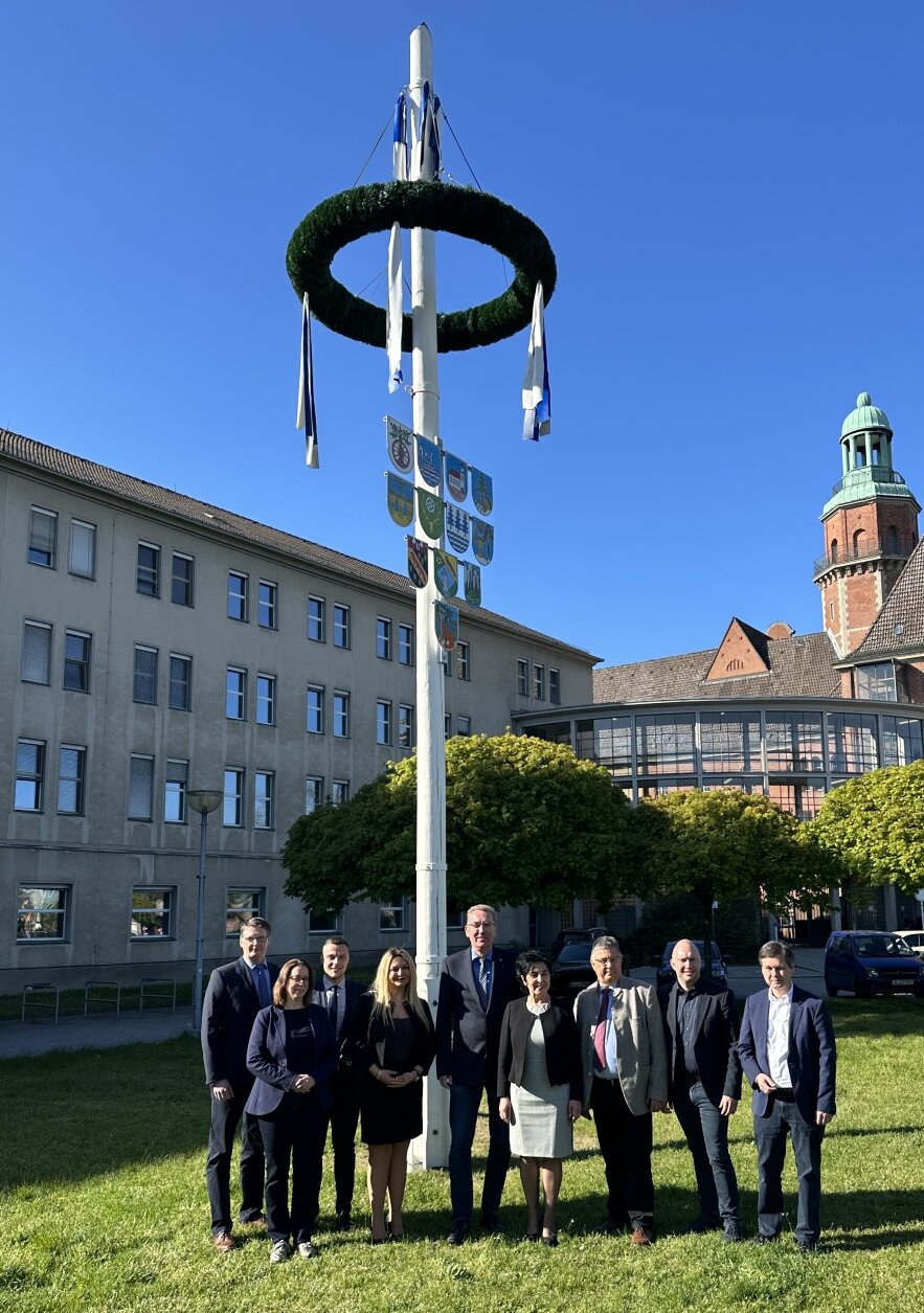 Auf den Tag genau heute vor 35 Jahren besiegelten Bad Steben und der Berliner Bezirk Reinickendorf ihre Städtepartnerschaft. So stand der Besuch einer vierköpfigen Delegation aus dem Bayrischen Staatsbad mit Bürgermeister Bert Horn an der Spitze natürlich unter dem Eindruck dieses Jahrestages. Nach sonntäglichem Rundgang durch Alt-Tegel folgten die Gäste am späten Nachmittag der Einladung von Bezirksamt und Bezirksverordnetenversammlung zum Erinnerungsfoto vor dem Maibaum am Rathaus.