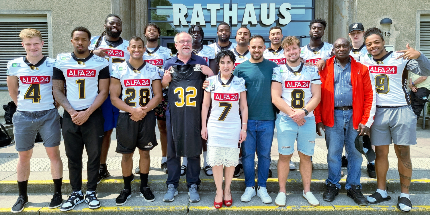 Um sich für das unbürokratische Handeln des Bürgeramtes persönlich zu bedanken, ließen es sich die Football-Hünen um Geschäftsführer Denis Milanovic nicht nehmen, Bezirksbürgermeisterin Emine Demirbüken-Wegner und dem Fachbereichsleiter Bürgerämter, Roman Skwirawski, persönlich einen Besuch abzustatten.