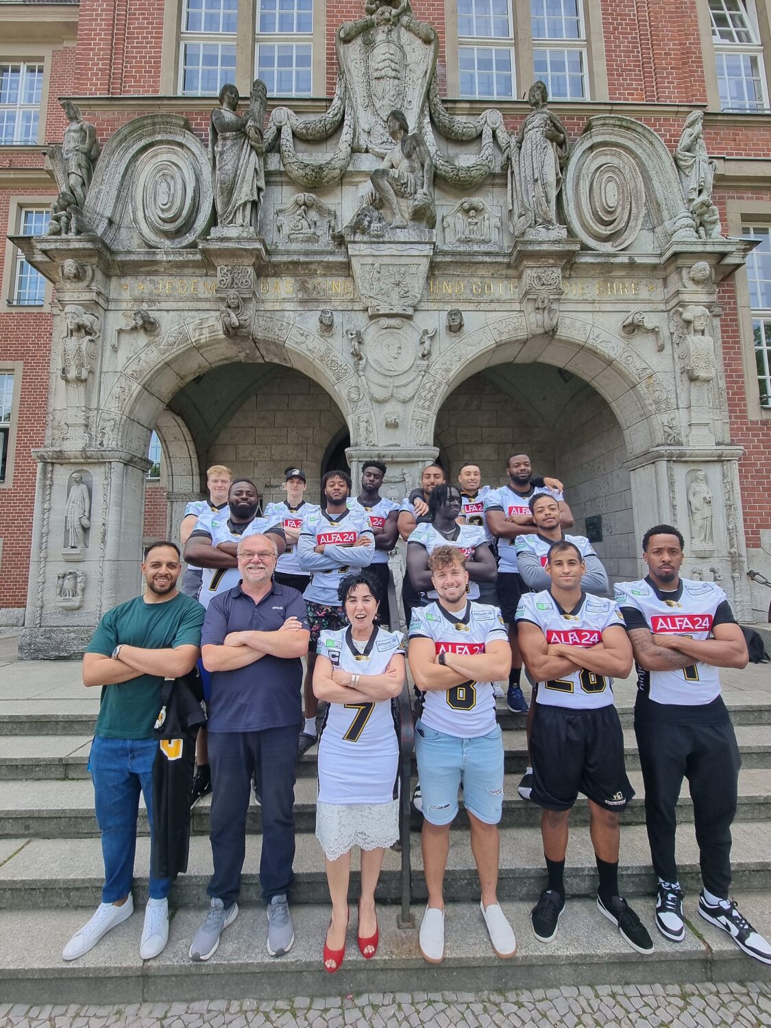Ungewöhnlicher Besuch am Freitag (23.6.) im Rathaus Reinickendorf: Die Berlin Adler – Erstligist im American Football – hatten sich um die Mittagszeit zum Fototermin angekündigt. Hintergrund der Aktion war eine vorangegangene Bitte des Vereins um Unterstützung bei der nötigen behördlichen Anmeldung aller zum Saisonstart neu hinzugekommenen Mannschaftsmitglieder. Das Bürgeramt Reinickendorf organisierte im Mai einen entsprechenden Sammeltermin und ersparte dem Team somit die sonst vielleicht mühsame Jagd nach Bürgeramtsterminen quer durch alle Bezirke.