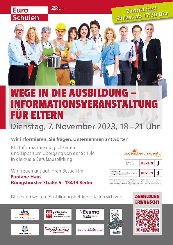 Für die Planung der Veranstaltung wird um eine Anmeldung über diese Website www.euro-schulen.de/berlin/news/details/einladung-zu-wege-in-die-ausbildung-im-fontane-haus gebeten. Hier gibt es auch weitere Informationen zu den präsentierenden Unternehmen.