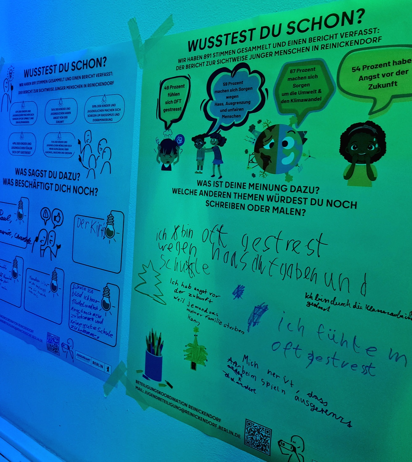 In Reinickendorf gibt es ab sofort neue „Mitmach-Plakate“ für Kinder und Jugendliche. Die Plakate zeigen auf der einen Seite die wichtigsten Ergebnisse des Berichts zur Sichtweise junger Menschen, der im Sommer erschienen war. Auf der anderen Seite können Kinder und Jugendliche ihre Meinungen und Kommentare direkt auf die Plakate schreiben oder kleben. Es gibt eine Plakat-Version für Kinder und eine für Jugendliche.