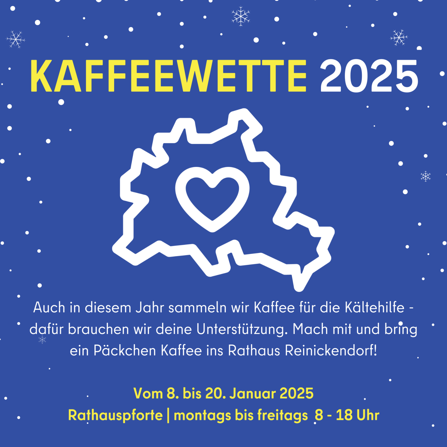 Gesammelt wird in allen Bezirken im Zeitraum vom 8. Januar bis 20. Januar 2025. Die Bürgerinnen und Bürger der beteiligten Bezirke sind herzlich dazu aufgerufen, die Aktion für die Kältehilfe zu unterstützen und ein Päckchen Kaffee zu spenden. Der gespendete Kaffee kann in den Pförtnerlogen der Rathäuser in den beteiligten Bezirken abgegeben werden.