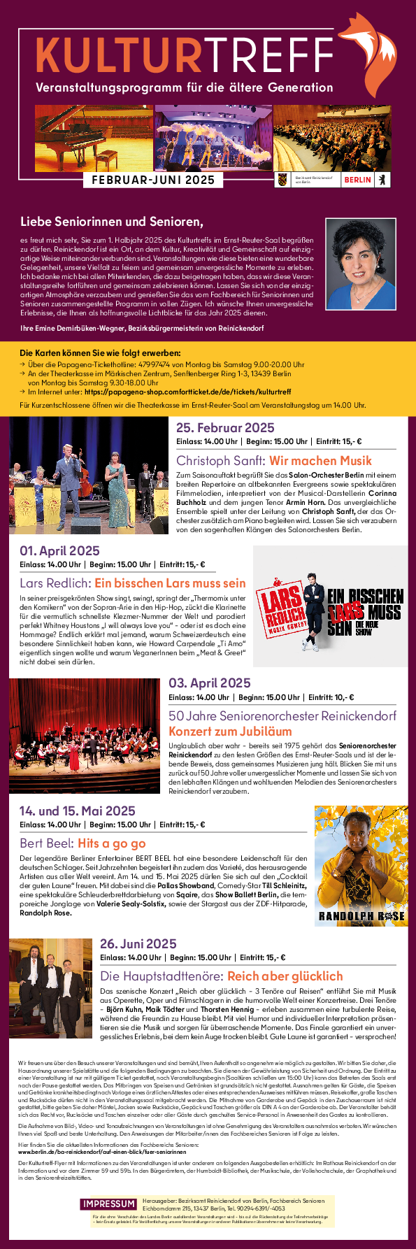 Das Jahr 2025 ist noch jung, doch die neue Kulturtreff-Saison beginnt schon in wenigen Wochen. Der zuständige Fachbereich des Bezirksamtes hat den Seniorinnen und Senioren erneut ein Programm mit tollen Konzerten für das 1. Halbjahr 2025 zusammengestellt. „Wir feiern Jubiläen, Interpreten aus dem Fuchsbezirk, die deutschlandweit zu Ruhm gelangten, sowie beliebte und bekannte Künstler, die unvergessliche Showmomente in unseren Ernst-Reuter-Saal zaubern werden. Und das alles zu bezahlbaren Preisen!“, sagt Reinickendorfs Bezirksbürgermeisterin Emine Demirbüken-Wegner (CDU).