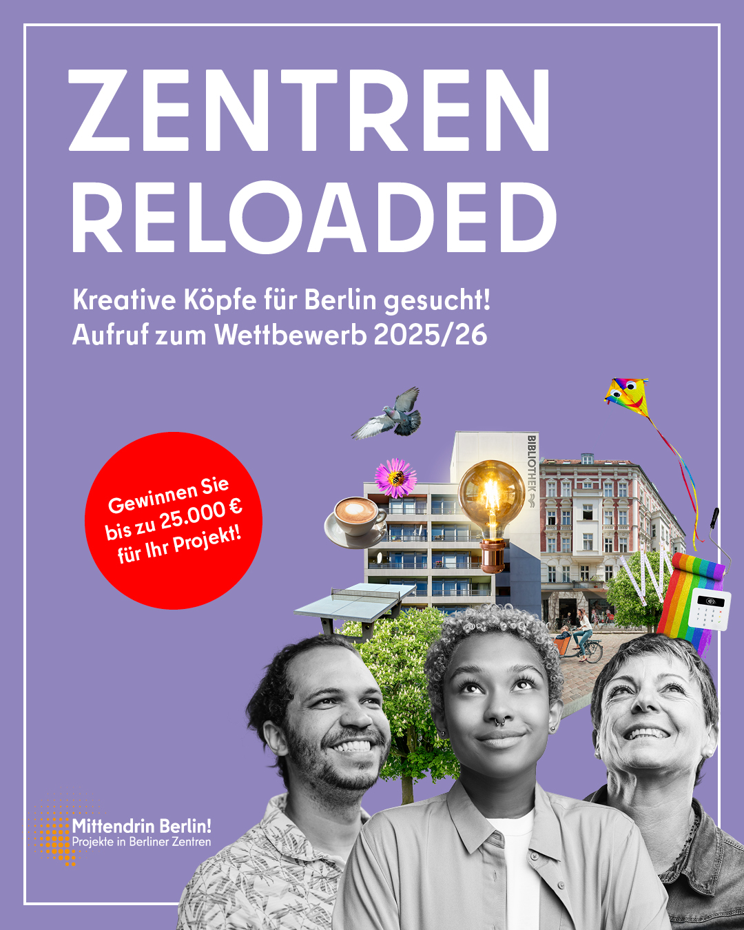 Der Wettbewerb „Mittendrin Berlin! Projekte in Berliner Zentren 2025/26“ ist gestartet. Gesucht werden kreative Konzepte zur Belebung von Geschäftsstraßen und Zentren in Berlin. Unter dem Motto „Zentren reloaded – Kreative Köpfe für Berlin gesucht!“ fördert das Programm Projekte, die neue Impulse für das städtische Miteinander setzen – insbesondere durch die Entwicklung sogenannter „Dritter Orte“. Gemeint sind Räume, die weder dem Wohnen noch dem Arbeiten zugeordnet sind, sondern der Begegnung und dem Austausch dienen.