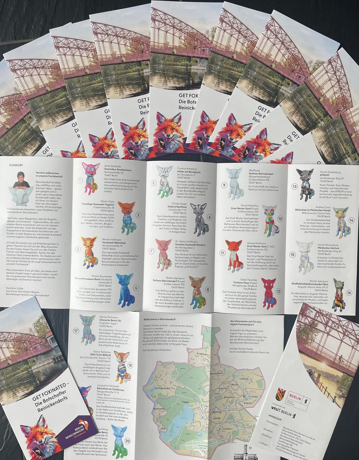 Mit der Veröffentlichung eines informativen Flyers geht die Reinickendorfer Fuchsparade in die finale Phase. Nach der erfolgreichen Rückkehr der kunstvoll gestalteten Fuchsskulpturen an sichere, gut erreichbare Orte im Bezirk gibt es nun einen Begleitflyer, der alle 20 Skulpturen samt ihren Künstlerinnen und Künstlern sowie den neuen Standorten übersichtlich präsentiert. Eine detaillierte Reinickendorf-Karte hilft dabei, die Kunstwerke im Bezirk zu entdecken.
