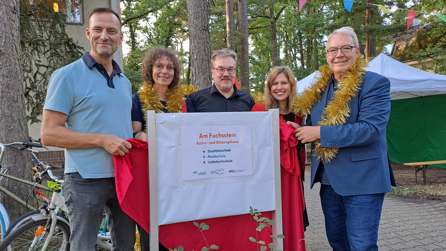 Bei strahlendem Sonnenschein kamen über 400 Gäste nach Frohnau zum ersten gemeinsamen Gartenfest von Stadtbibliothek, Volkshochschule und Musikschule. Der Kultur- und Bildungsstandort des Bezirks soll ein lebendiger Ort der Kultur und Bildung im Herzen Frohnaus werden – offen für alle, generationsübergreifend und nah an den Menschen. Das betonte der Leiter des Amtes für Weiterbildung und Kultur Bernd Schmieden in seiner Begrüßung. Am Nachmittag enthüllte Kultur- und Bildungsstadtrat Harald Muschner (CDU) das neue – noch provisorische – Namensschild „Am Fuchsstein – Kultur- und Bildungshaus“. „Der Name wurde von den Mitarbeiterinnen und Mitarbeitern der drei Einrichtungen gemeinsam entwickelt“, erläutert Bezirksstadtrat Muschner.