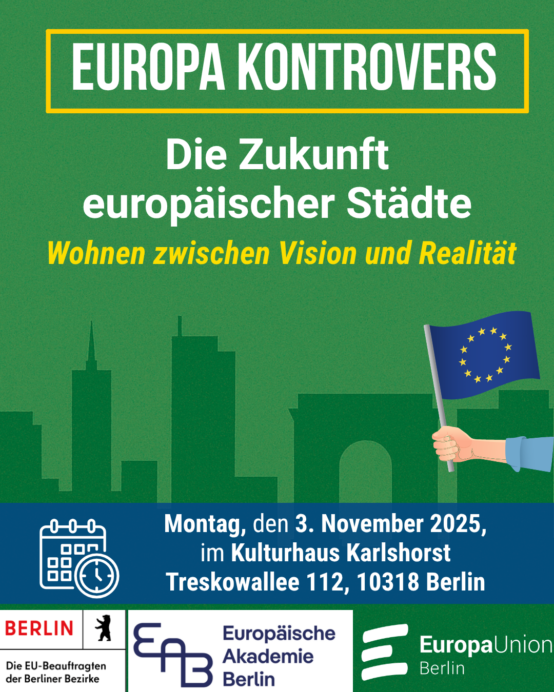 Die Reihe „Europa Kontrovers“ wird von der Europa-Union Berlin, der Landesarbeitsgemeinschaft der Europabeauftragten der Berliner Bezirke ausgerichtet.