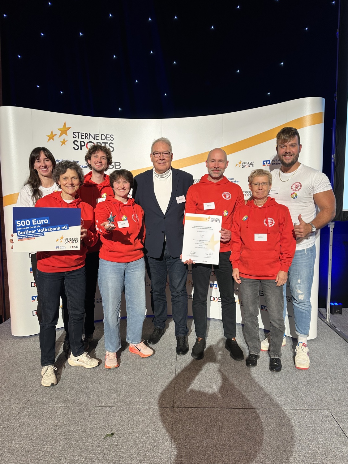 Bei der Preisverleihung der „Sterne des Sports“ am Montag, 11. November 2025, wurde der SC Tegeler Forst e.V. für sein herausragendes soziales Engagement mit dem Silbernen Stern des Sports 2025 ausgezeichnet. Der Verein erhielt die Ehrung für die Aktion „Dein Sprung für die Krebsforschung“, die eindrucksvoll zeigt, wie Sport Menschen verbindet und Gutes bewirken kann.