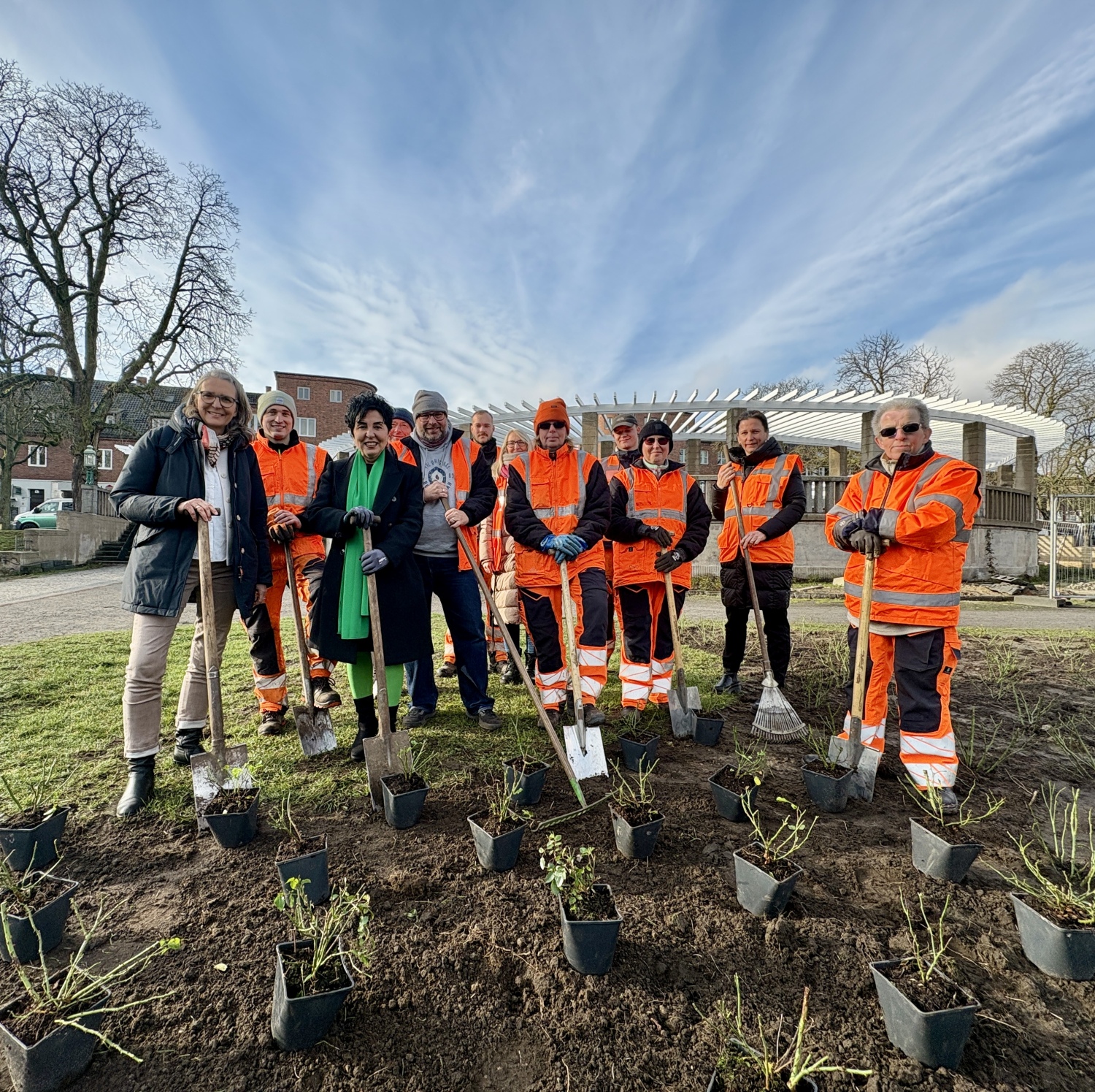 In der vergangenen Woche konnten die Vorbereitungsarbeiten für die Pflanzung von über 2.000 Gewächsen abgeschlossen werden. In den folgenden Tagen werden unterhalb der Pergola sowie entlang der Wege in die bereits vorbereiteten Beete insgesamt 1.000 rote und gelbe Rosen sowie 1.250 Bodendecker gepflanzt. Diese Tätigkeit übernehmen die Gärtnerinnen und Gärtner des Straßen- und Grünflächenamtes, die von den Auszubildenden des Bereiches Garten- und Landschaftsbau tatkräftig unterstützt werden. Heute wurden außerdem noch die Bauzäune an der zweiten Treppe entfernt, so dass nun wieder der vollständige Zugang zum Platz möglich ist.