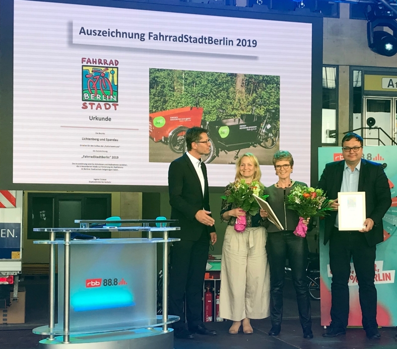 Der Bezirk Spandau hat dieses Jahr zusammen mit dem Bezirk Lichtenberg die Auszeichnung „FahrradStadtBerlin“ 2019 für das Projekt fLotte – kommunal erhalten. Am Samstag 27.04.2019 nahm Dr. Cornelia Niemeitz in Vertretung von Frank Bewig, Stadtrat für Bauen, Planen und Gesundheit, den Preis für den Bezirk Spandau auf der VELOBerlin 2019 entgegen. Die Auszeichnung „FahrradStadtBerlin“ wird als Anerkennung für Verdienste um die Förderung des Radverkehrs in Berlin von der Senatsverwaltung für Umwelt, Verkehr und Klimaschutz jährlich verliehen.